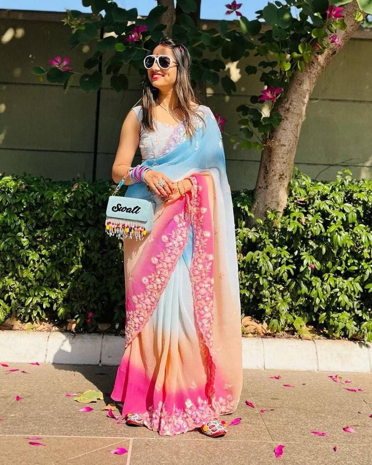 ผ้าซารีดีไซน์ใหม่จาก Fatema Fashion ผ้าจอร์เจตต์ปักลายแฟนซีด้วยงานปักดิ้นทอง พร้อมผ้าคลุมไหล่แบบ C-Pallu ประดับเลื่อม เหมาะสำหรับงานปาร์ตี้