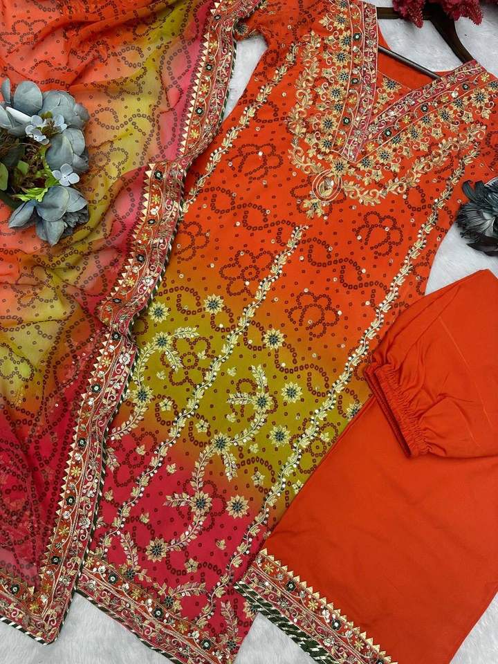 Faux Georgette Fancy Digital Print With Heavy Embroidery and Sequins Work Top With Palazzo and Dupatta Set Full Stitched