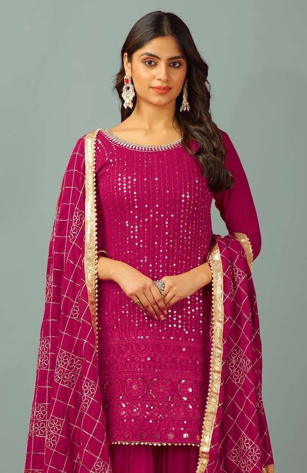 เสื้อปักลาย Georgette faux และเย็บปักด้านบนด้วยลาย Moti ทำงานลูกไม้แขนเต็มและ sharara พร้อมงานปักขนาดใหญ่ dupatta