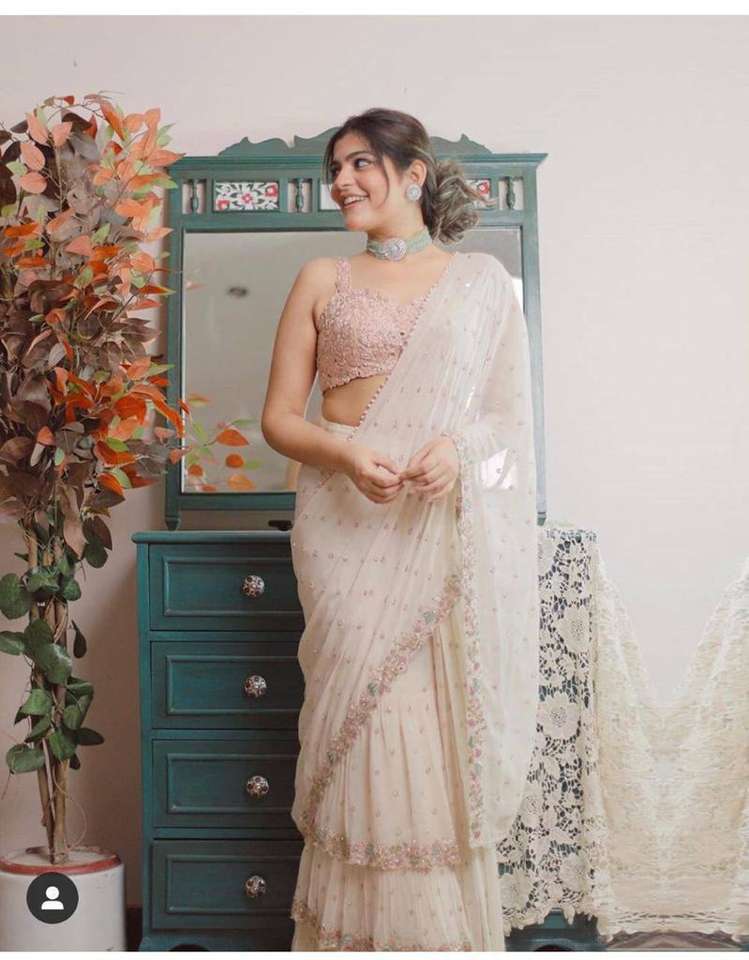 Faux Georgette With Embroidery Work With Raffle With Real Miral Hand Work With Pallu Moti Less Border (5.5 METER ) High Quality