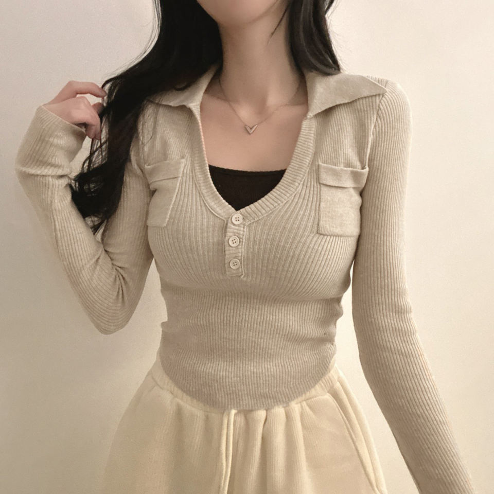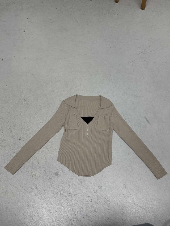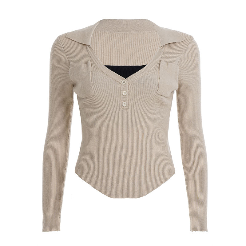 เสื้อถักไหมพรมคอปกหวาน แขนสั้น สไตล์ Y2K แต่งกระเป๋าสีสันตัดกัน สำหรับผู้หญิง