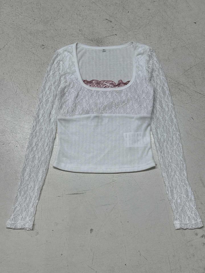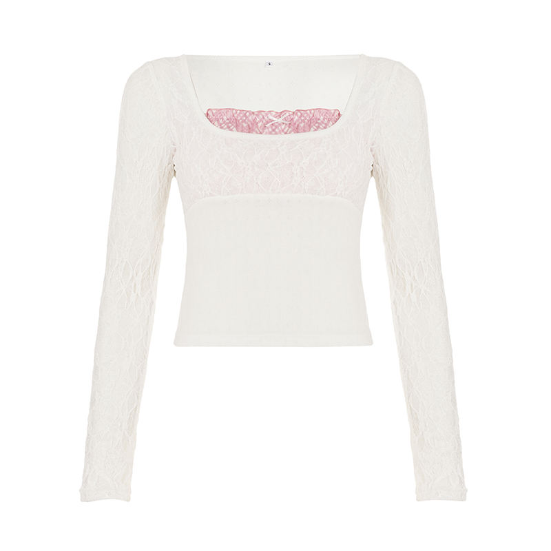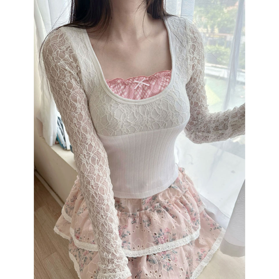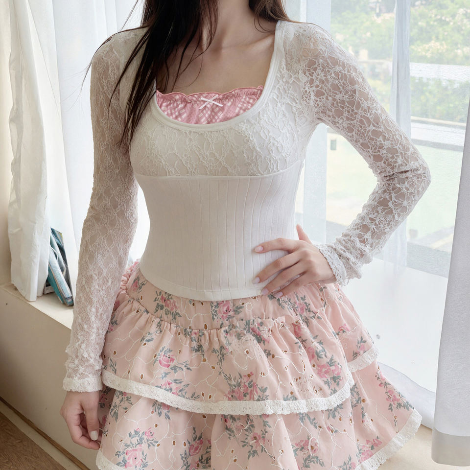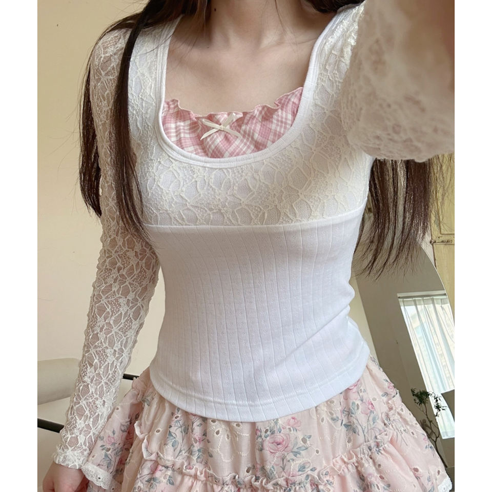 เสื้อท่อนบนทรงพอดีตัว แขนยาว คอวี แต่งลูกไม้ซ้อนเลเยอร์ ระบายอากาศได้ดี ผ้าถักเนื้อแน่น สไตล์หวานๆ สำหรับผู้หญิง แนว Y2K