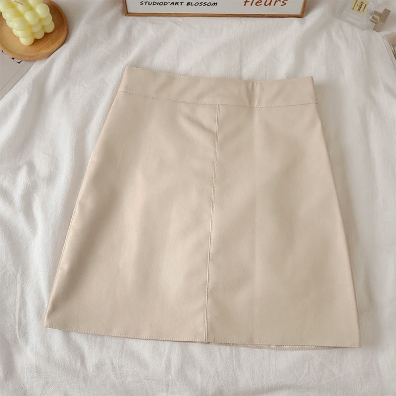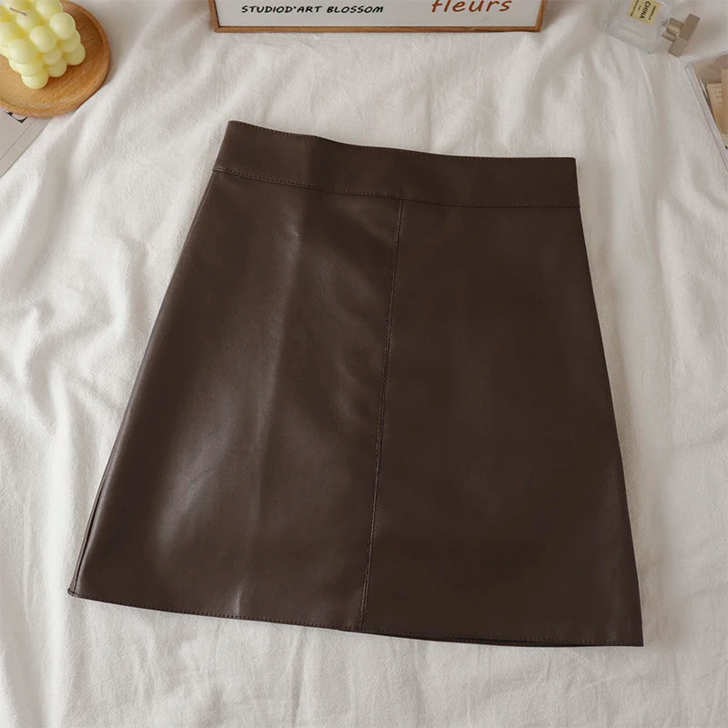 กระโปรงมินิหนังเทียมสำหรับผู้หญิงเอวสูงทรงเอไลน์ กระโปรงสั้น PU พร้อมกางเกงซับในในตัว สีดำ สีน้ำตาล เทรนด์แฟชั่นฤดูใบไม้ร่วงฤดูหนาว