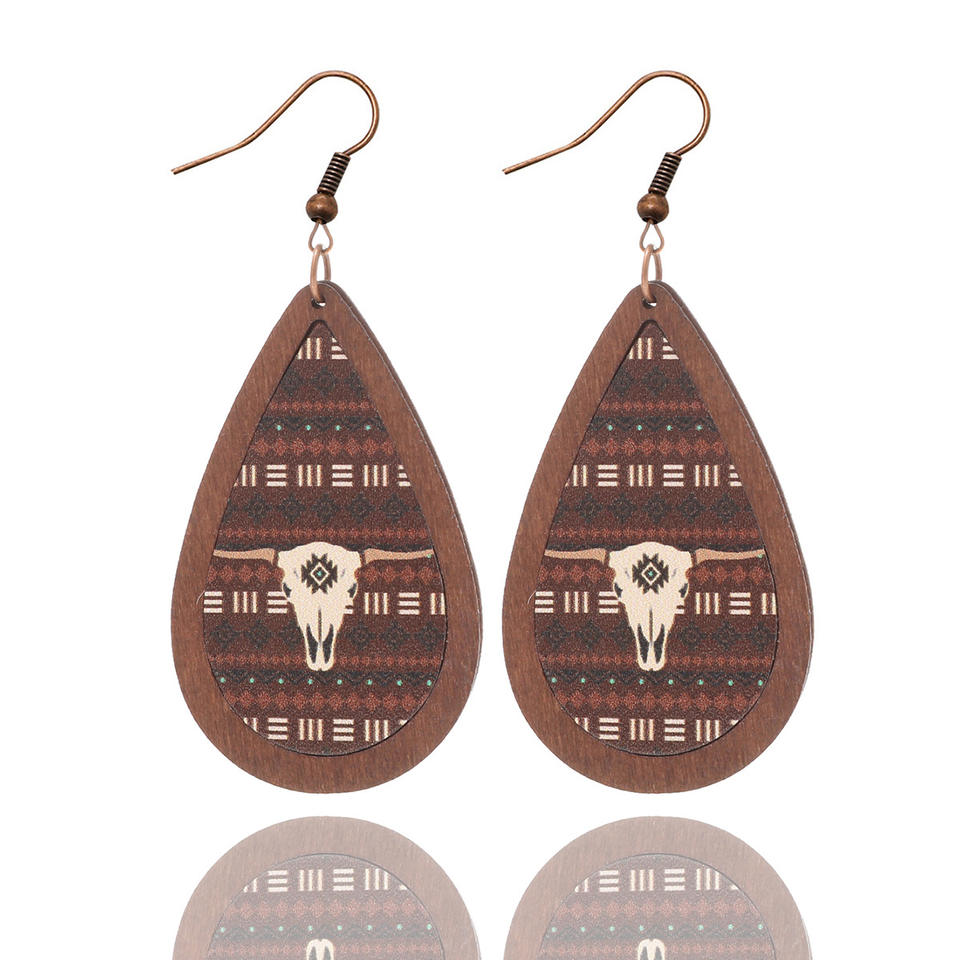 หนังเทียมอินเทรนด์ ป้องกันอาการแพ้ วินเทจ ลายกระบองเพชร หัววัว ต่างหูจี้ไม้ประกบสำหรับผู้หญิง UIONEN 902