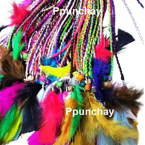 พู่ขนนกเส้นเล็กแบบพันผมพร้อมคลิปต่อผม แบบชนเผ่าแอนเดียน ปุนชาย เปรู 32 ซม. งานฝีมือหลากสีสัน