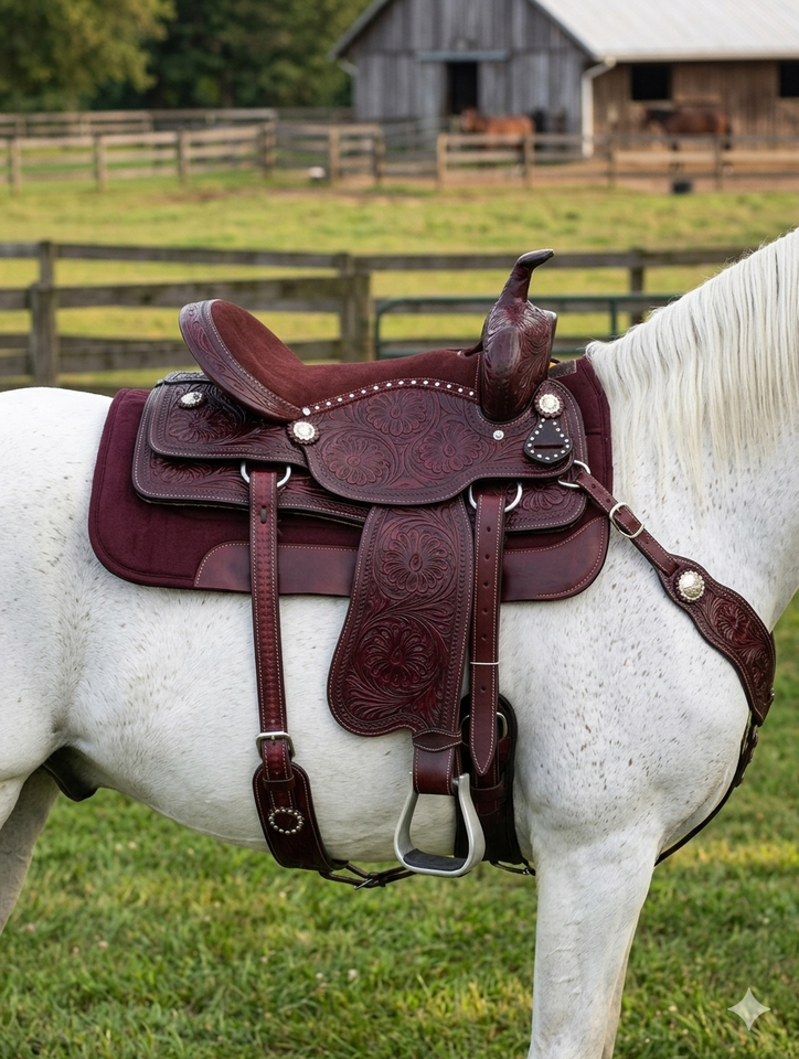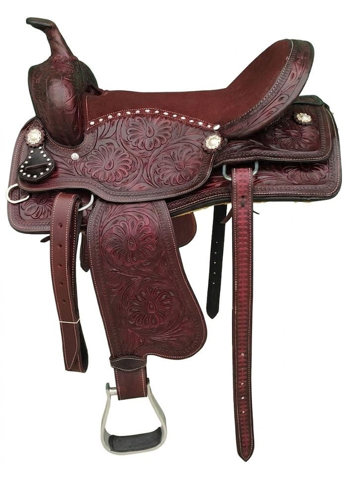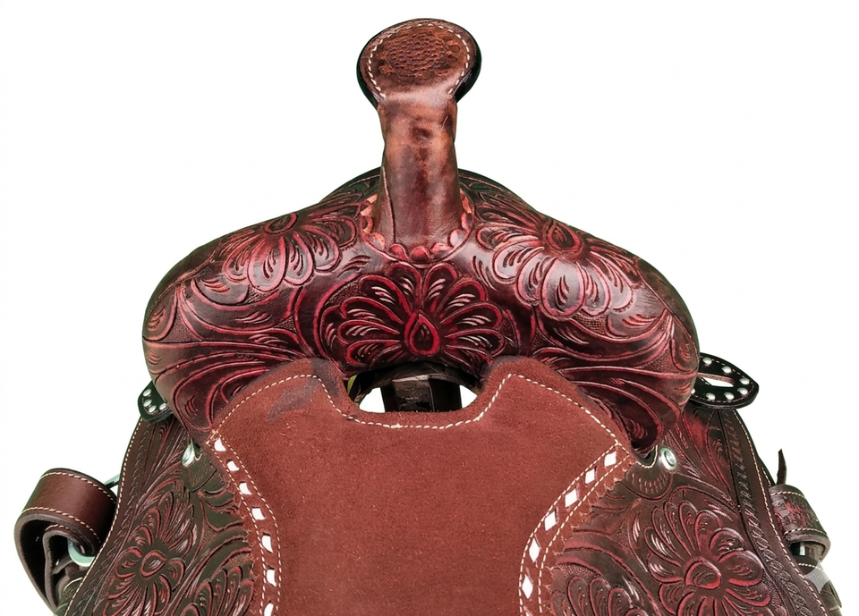 อานม้าหนังแท้แบบตะวันตกพร้อมสายรัดอกและสายรัดศีรษะ โครงอานทำจากไฟเบอร์กลาส มีจำหน่ายขนาด 15", 16", 17"