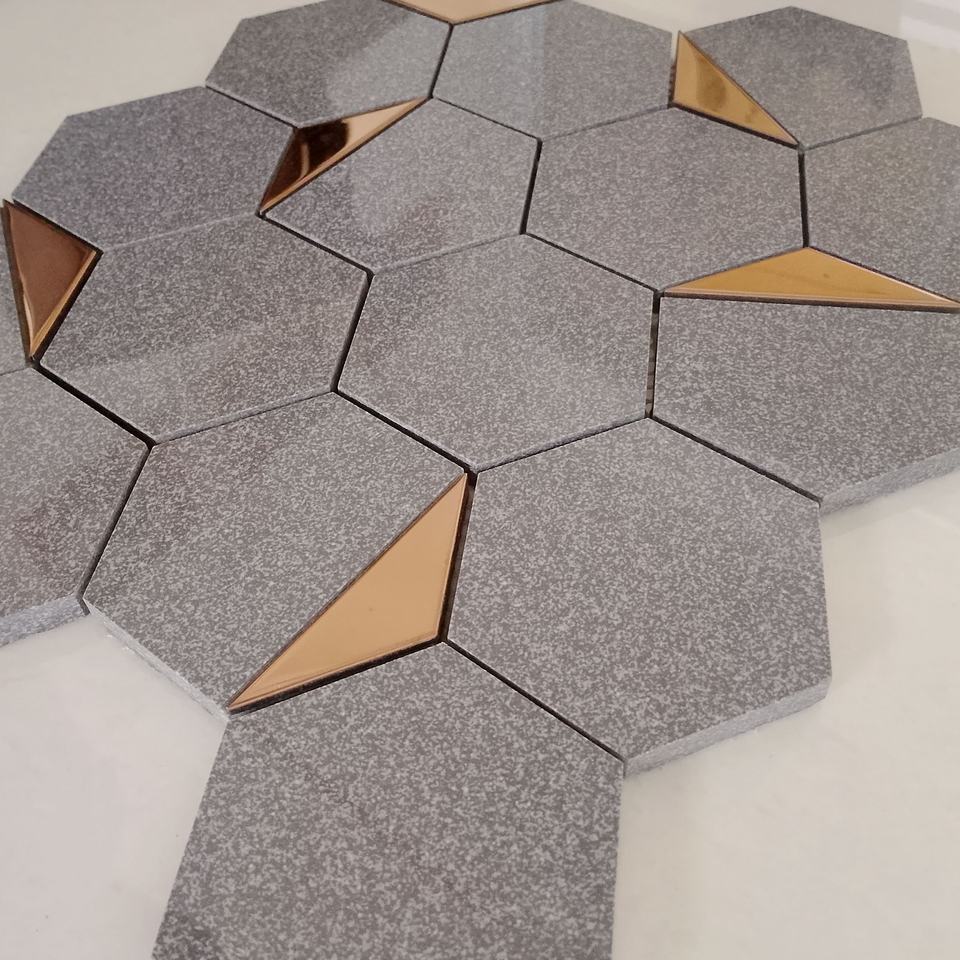 Feelthefinish กระเบื้องโมเสคเซรามิคทรงหกเหลี่ยม PVD สีโรสโกลด์73มม. เคลือบเงาสำหรับสำนักงานและโชว์รูมมีผนังห้องประชุม