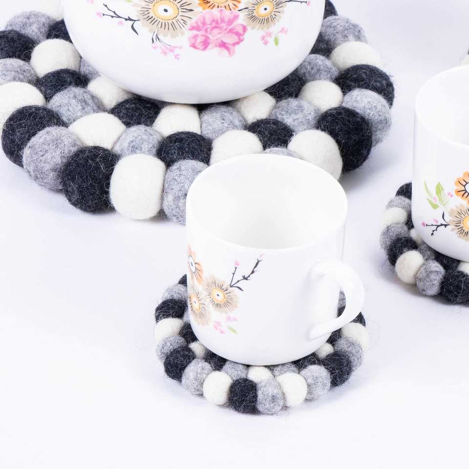 แผ่นรองพื้นทำมือจากขนสัตว์เนปาล ยี่ห้อ Feltandwool รูปทรงกลม พร้อมพู่ห้อยขนาด 1 ซม. ชุด 4 ชิ้น ของขวัญขึ้นบ้านใหม่ พรมและแผ่นรองทำจากขนสัตว์