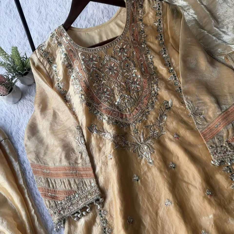 ชุดเสื้อผ้าสตรีแบบสามชิ้น ประกอบด้วยเสื้อปักลายผ้าเฟนดี้ ซัลวาร์ และผ้าคลุมไหล่ พร้อมซับในไมโคร สำหรับงานเทศกาลและงานเฉลิมฉลอง