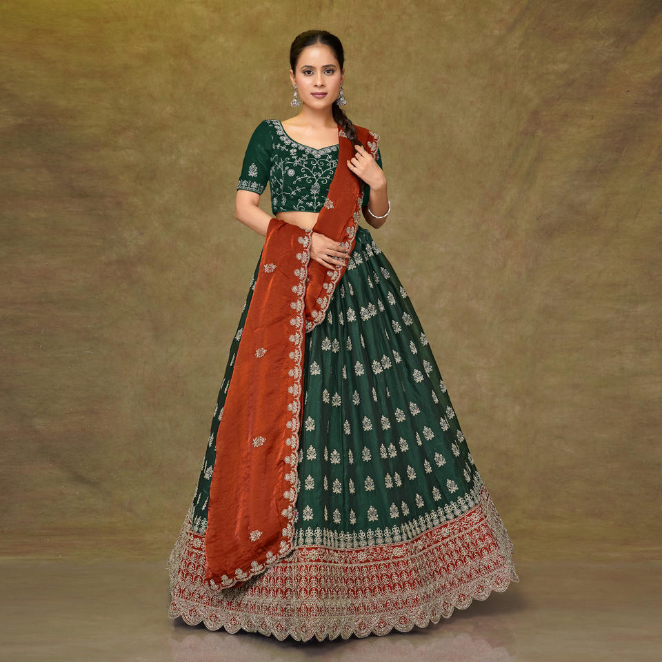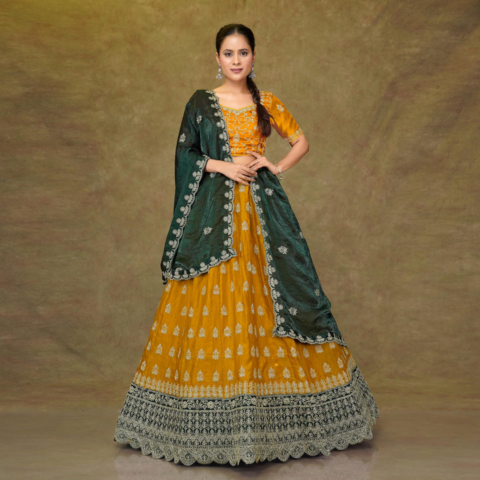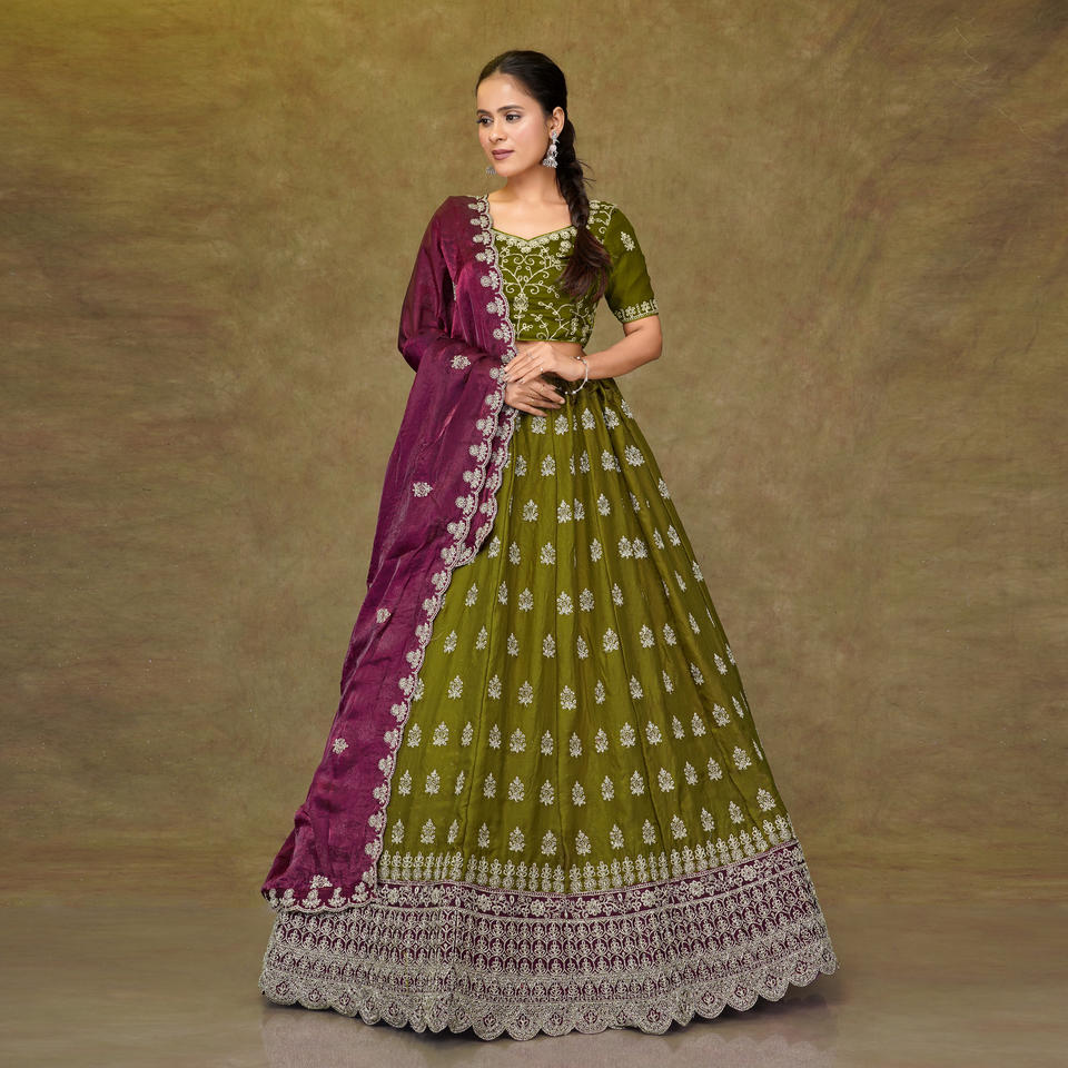 ชุดเลเฮนกาโชลีผ้าเฟนดี้แบบดั้งเดิม ตกแต่งด้วยงานปักที่ชายเสื้อ | ชุดงานพรอมแบบแห้งเร็ว | ขายส่งสินค้า