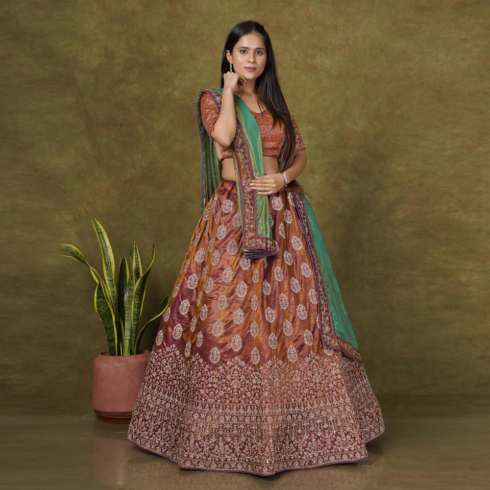ชุดเลเฮนกาโชลีผ้าเฟนดี้เน็ต | ลายปักเลื่อมแบบเส้นด้ายหนาแน่น | ขอบตกแต่งลวดลายประณีต | ชุดผ้าคลุมไหล่ | ความยาวระดับพื้น | งานแต่งงานริมชายหาดในวันดิวาลี