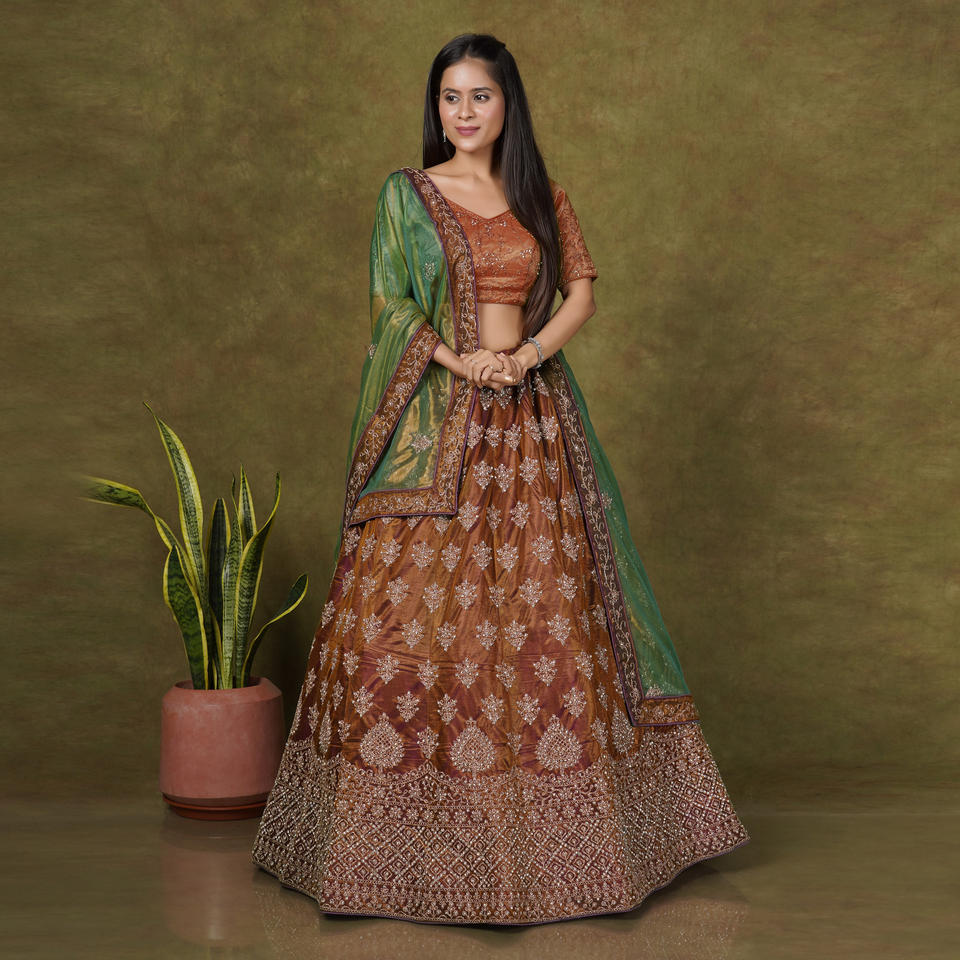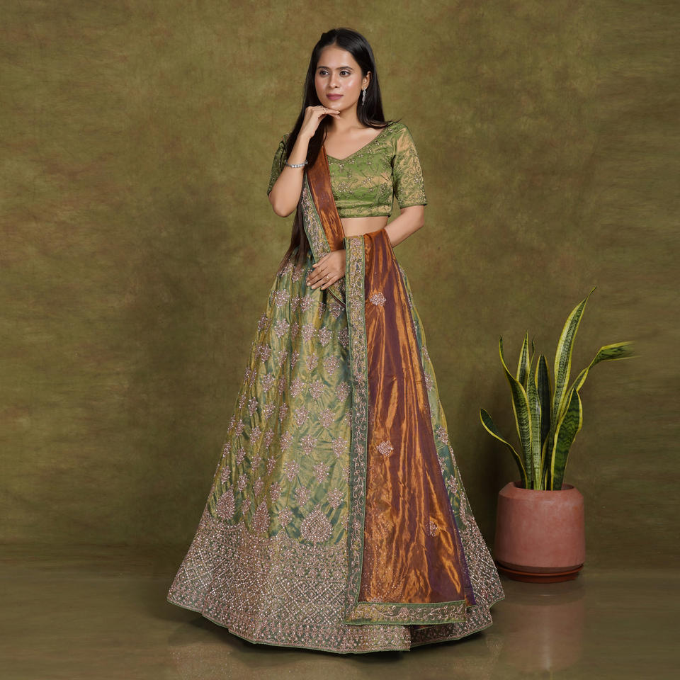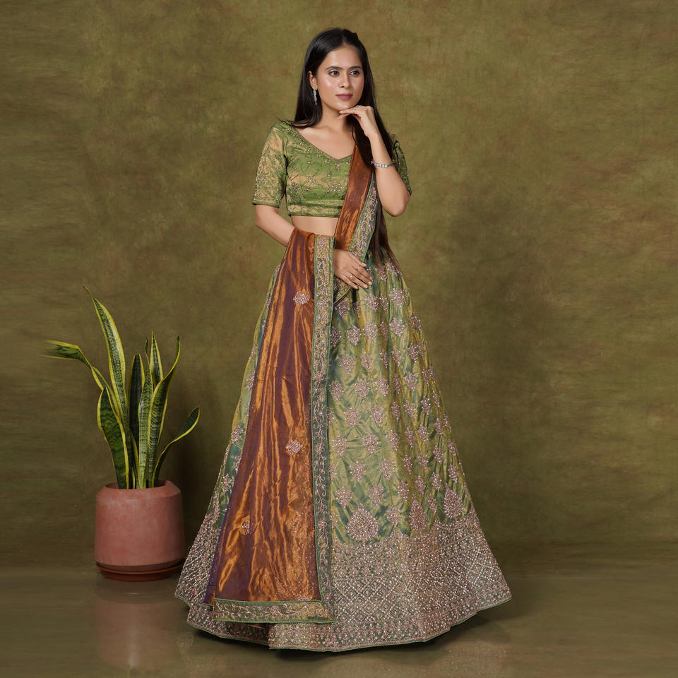 ชุดเลเฮนกาโชลีผ้าเฟนดี้เน็ต | ด้ายโลหะปักเลื่อมบุตตา | ชายเสื้อแบบกว้างทำมือ | ชุดผ้าคลุมไหล่แบบตัดกันสำหรับงานเฉลิมฉลองสุดหรู