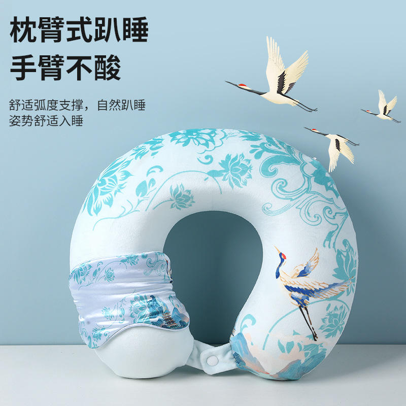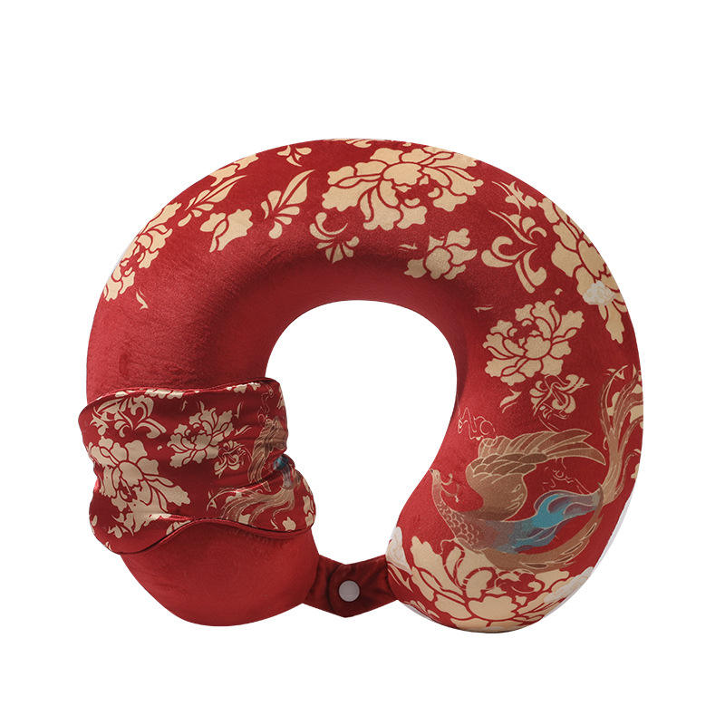 หมอนรองคอรูปตัวยู Fengshuiqi สีแดงกำมะหยี่ ลายเครนและปลาคาร์ฟ พกพาสะดวกสำหรับการเดินทางบนเครื่องบินและงีบหลับในออฟฟิศ