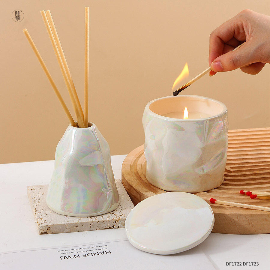เทียนหอม Fengxi Chaozhou ในโถเซรามิกทรงไม่สมมาตรเคลือบเงาแบบมุก พร้อมฝาปิด สไตล์โมเดิร์น รุ่น DF1722 DF1723