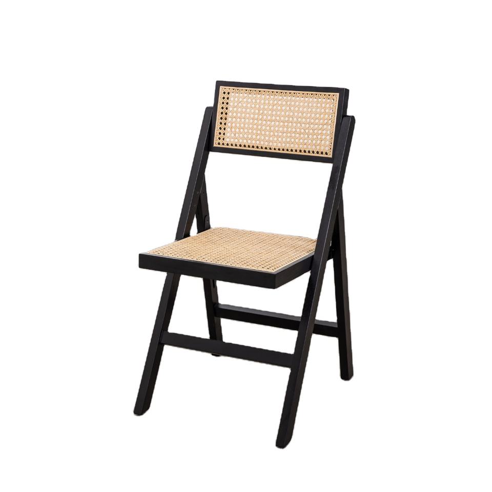 เก้าอี้ทานข้าวพับได้เฟรมไม้สักแท้ Fernand Modern พร้อมหวายสำหรับเฟอร์นิเจอร์บ้าน สีดำ