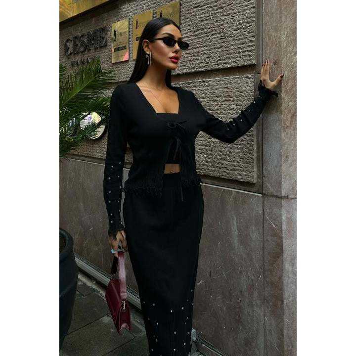 ชุดราตรีทรงเข้ารูป แขนยาว คอวี ประดับมุก สีดำ รุ่น Ferry Pearl Elegant