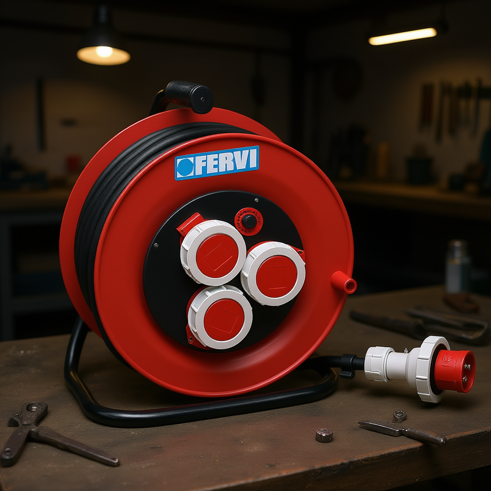 สายพ่วงอุตสาหกรรม Fervi แบบม้วนเก็บได้ 3 ช่องเสียบ ยาว 25 เมตร สำหรับงานหนัก พร้อมหูหิ้ว สำหรับใช้ในโรงงาน