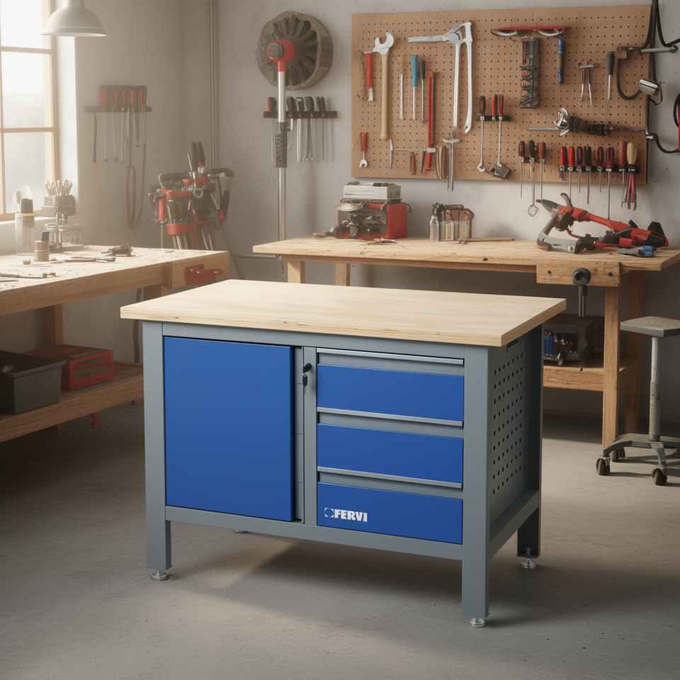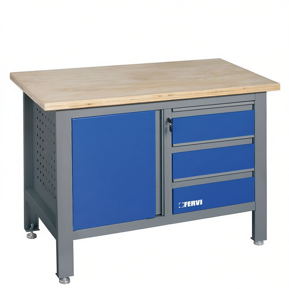 ชุดประกอบโต๊ะทำงานเฟอร์วี ขนาด 120x60 ซม. พร้อมท็อปไม้และลิ้นชักเก็บของสีน้ำเงิน สำหรับใช้ในโรงงาน