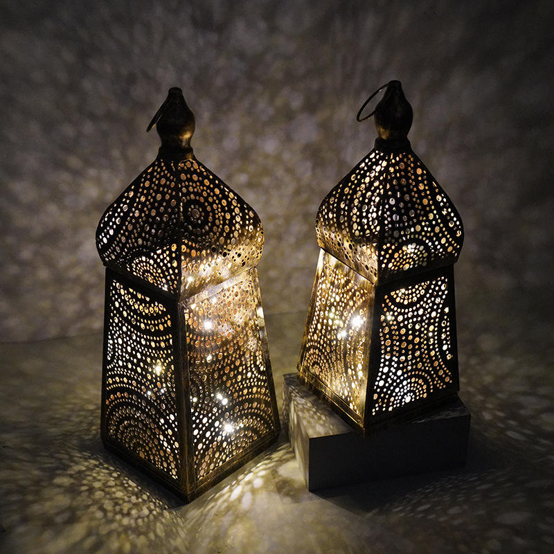 เทศกาลอาหรับอิสลามโคมไฟ LED โลหะสีทองโคมไฟตกแต่งโมร็อกโกที่วางเทียนโคมไฟรอมฎอนสำหรับ Eid al fitr