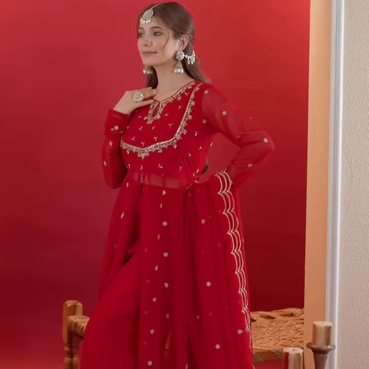 ชุดเดรสยาวสีแดงพิเศษสำหรับเทศกาล พร้อมผ้าคลุมไหล่ปักเลื่อมดีไซน์เนอร์