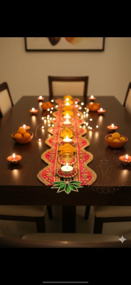 ของตกแต่งโต๊ะอาหารในเทศกาลดิวาลี ผ้าปูโต๊ะรังโกลีทำมือ พร้อมด้วยดียาส่องแสง ของตกแต่งโต๊ะรังโกลีแบบดั้งเดิมของอินเดีย ทำด้วยมือ