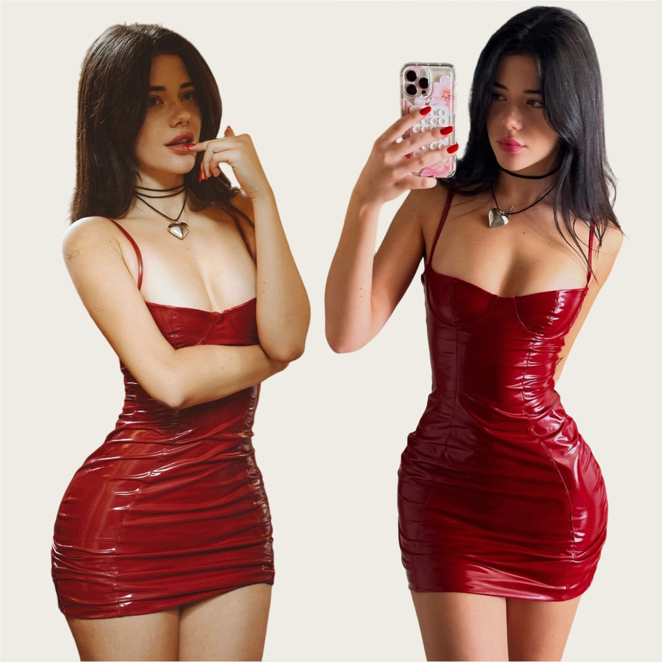ชุดเดรสสั้นแบบผูกคอ ผ้า PU เงา แต่งแผ่นซิลิโคนดันทรงในตัว พร้อมแผ่นซิลิโคนโปร่งแสง สำหรับงานปาร์ตี้คริสต์มาส