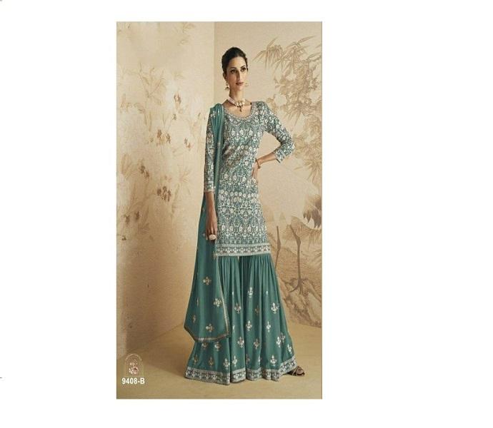 ชุดการาร่าสำหรับงานเทศกาล พร้อมงานปักลายโซ่ประดับเลื่อม ผ้าฟ็อกซ์จอร์เจตต์ คุร์ตา ปาลาซโซ และผ้าคลุมไหล่