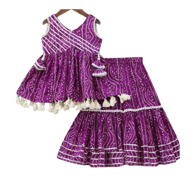 ชุดเลเฮนกาโชลีสำหรับงานเทศกาลสำหรับเด็กผู้หญิง – ชุดพื้นเมืองสีม่วงพิมพ์ลายพร้อมพู่ประดับปอมปอม