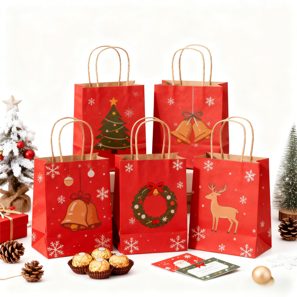 ถุงของขวัญกระดาษคราฟท์สีแดงแบบเป็นมิตรกับสิ่งแวดล้อม ย่อยสลายได้ พร้อมหูหิ้ว สำหรับใส่ของขวัญคริสต์มาส ช็อคโกแลต บัตรของขวัญ บรรจุภัณฑ์แบบกำหนดเอง