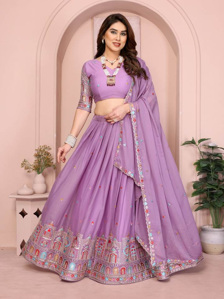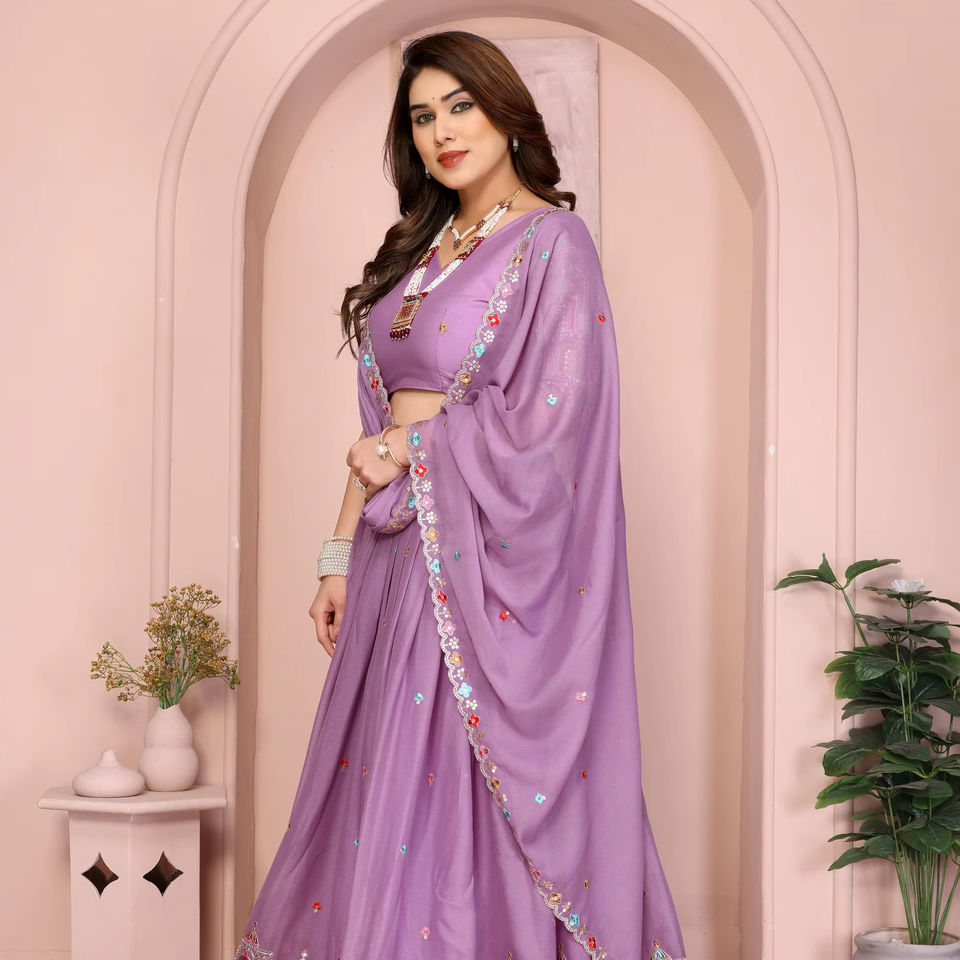 ชุดเลเฮนกาผ้าจอร์เจตต์ทรงบานพิเศษสำหรับเทศกาล พร้อมงานปักลายขอบเสื้ออย่างประณีต