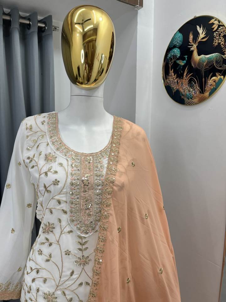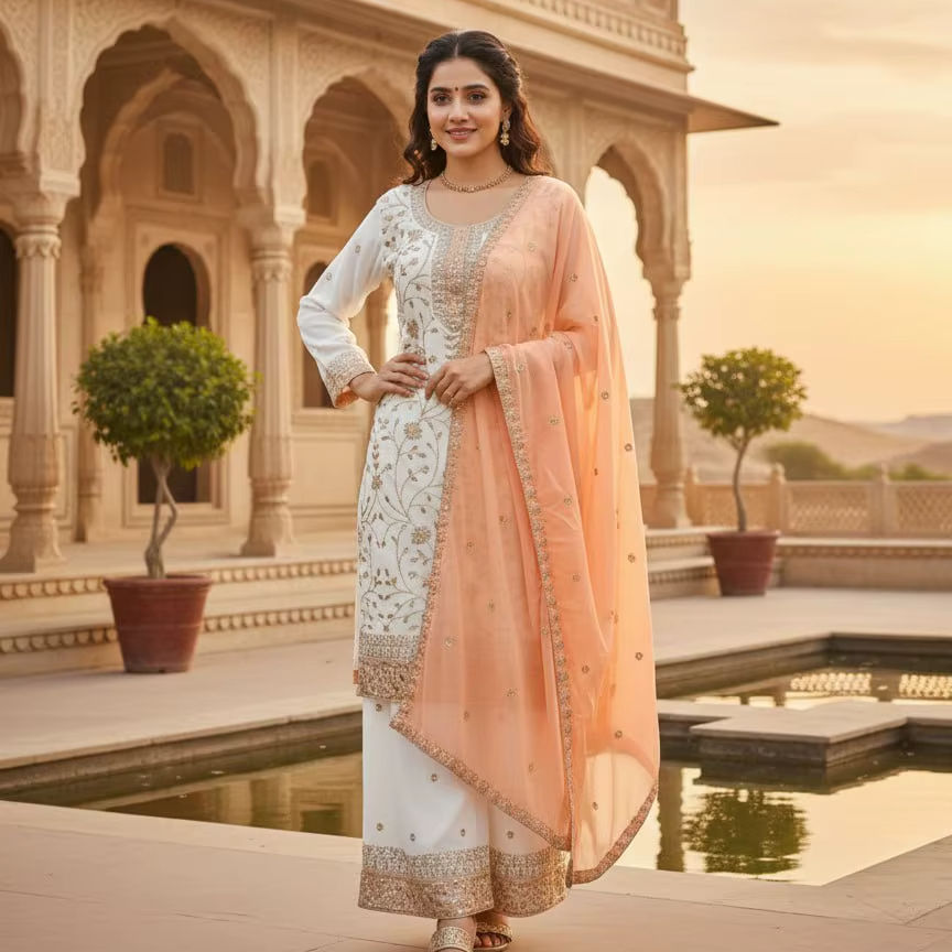 ชุดคุर्ติพร้อมกางเกงพลลาโซ่ลายพิเศษสำหรับเทศกาล พร้อมผ้าคลุมไหล่ 2.2 เมตร – เสื้อผ้าชาติพันธุ์ระดับพรีเมียม
