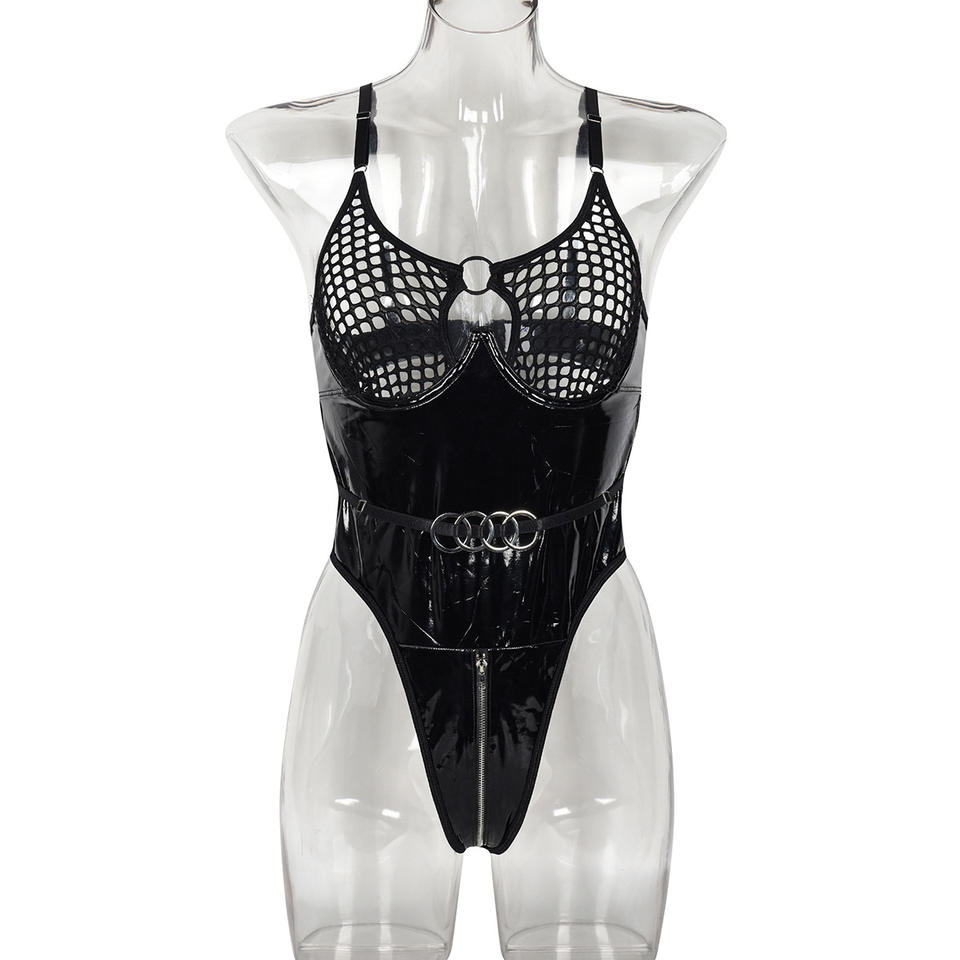 ชุดชั้นในเซ็กซี่ลายตารางเปิดหลังแบบชิ้นเดียวทำจากหนัง PU มีซิปและตาข่าย