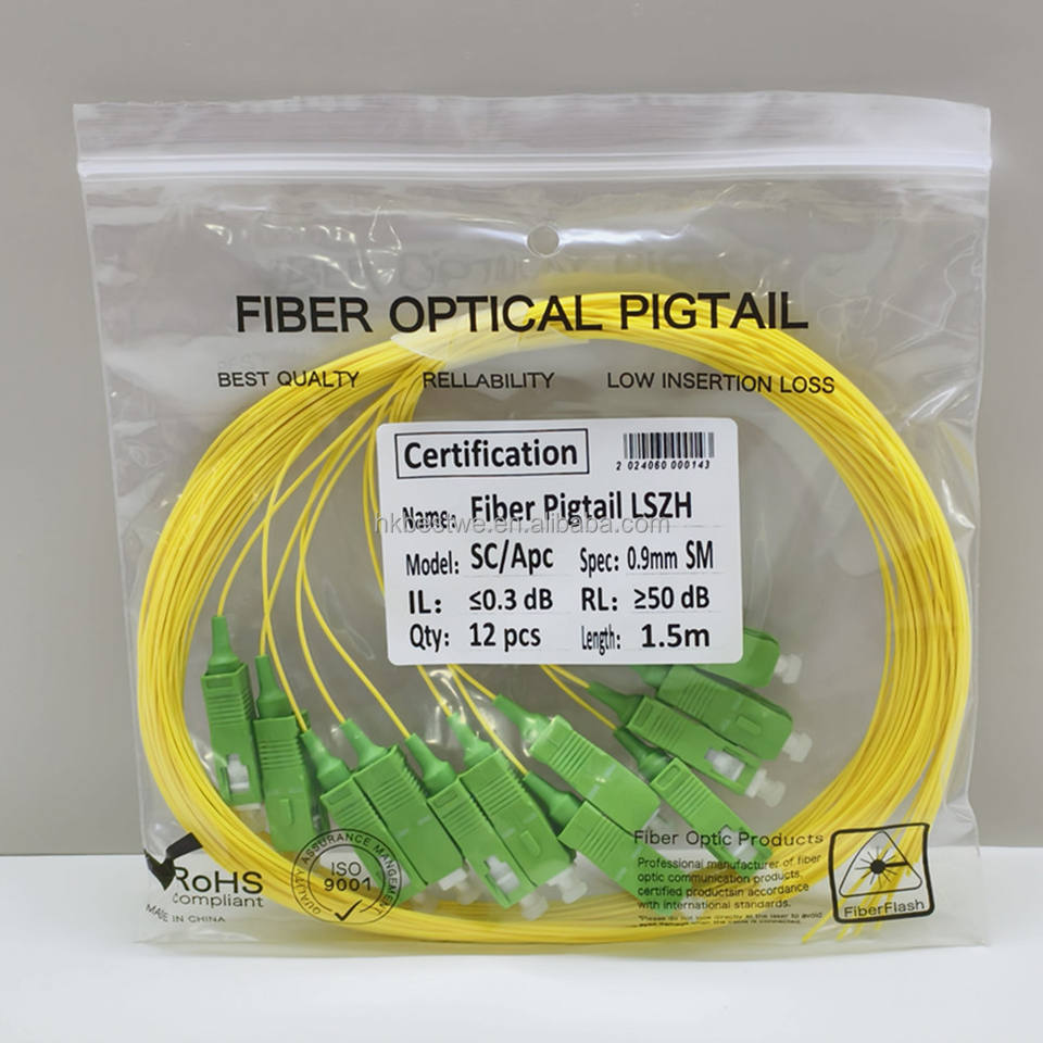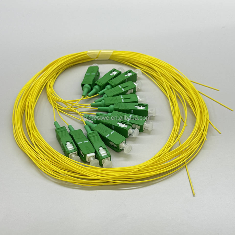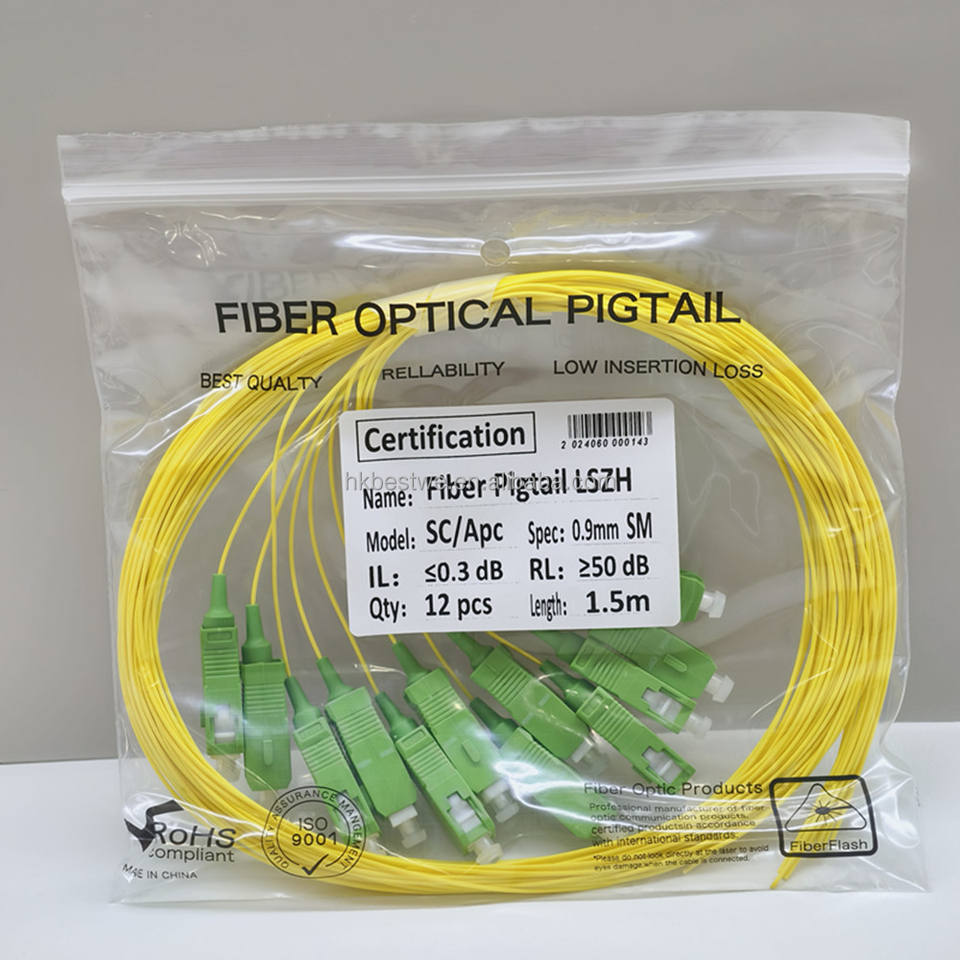สายไฟเบอร์ออปติก ความยาว 1.5 ม. เส้นผ่านศูนย์กลาง 0.9 มม. สีเหลือง ปลอกหุ้ม LSZH แบบ Single Mode SC/APC Pigtails สำหรับแผงเชื่อมต่อไฟเบอร์ ODF FTTH