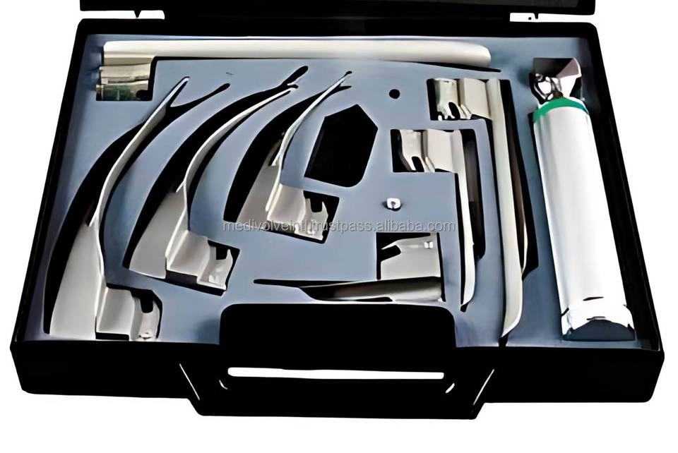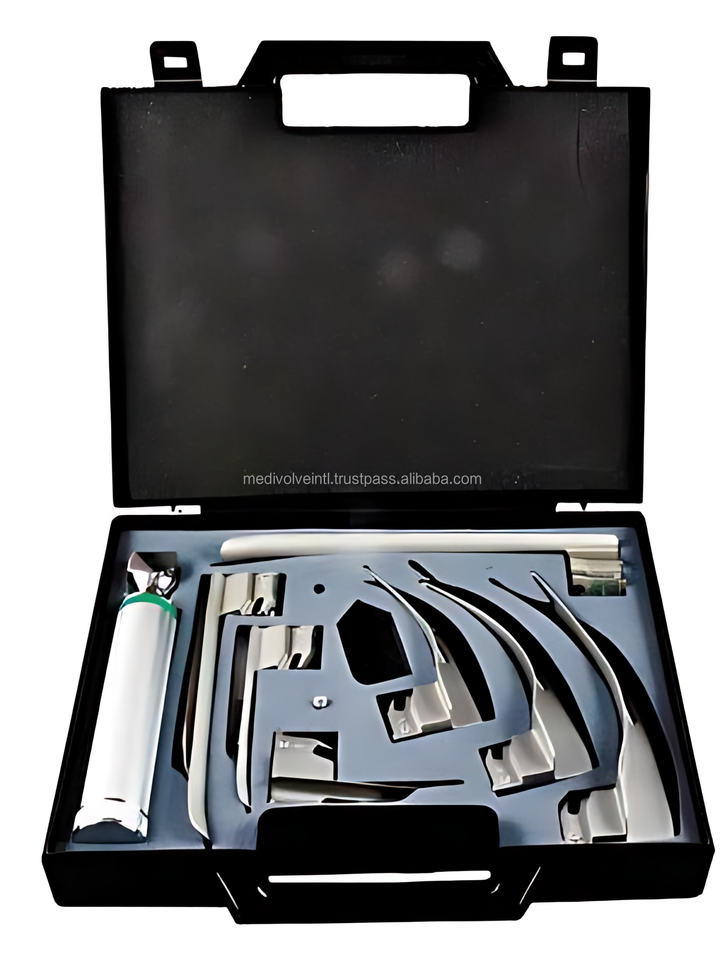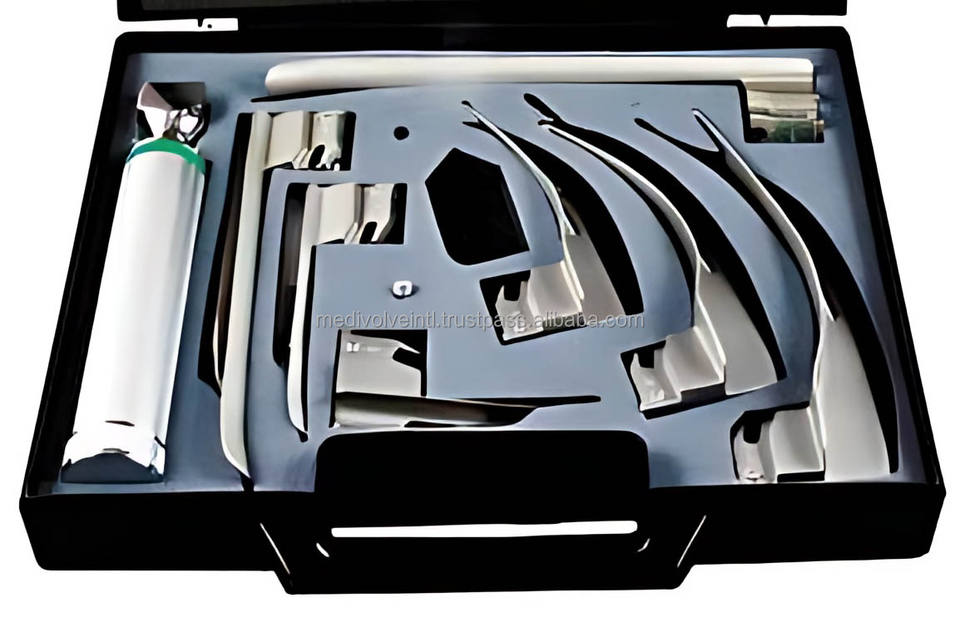 ชุดเครื่องมือส่องกล่องเสียงไฟเบอร์ออปติก Macintosh & Miller ทำจากสแตนเลสสตีล ใช้ไฟฟ้า มาตรฐาน CE ISO 3 ใบมีดโค้ง 4 ใบมีดตรง สำหรับหู คอ จมูก ใช้ในการดมยาสลบ