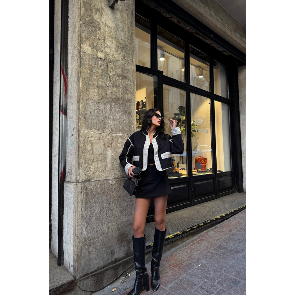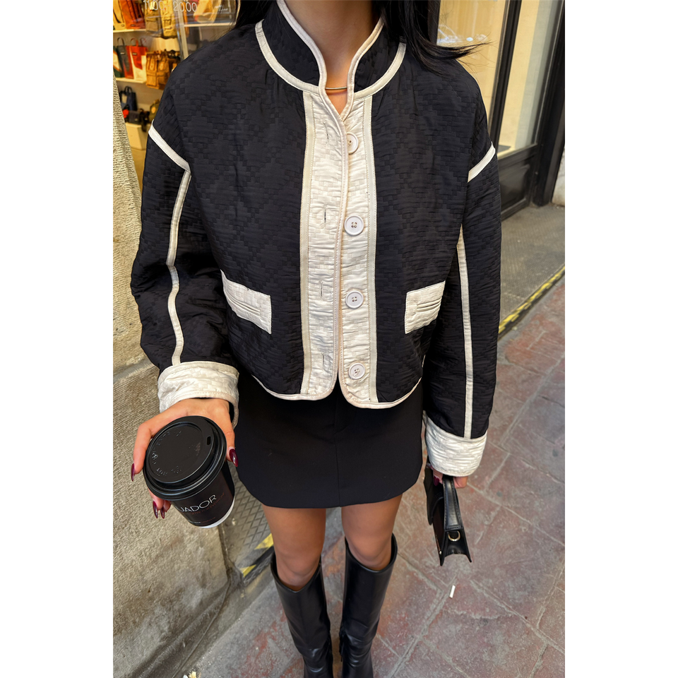 เสื้อแจ็คเก็ตผ้าลันโดเสริมใยไฟเบอร์สีดำแบบเย็บติดกันสำหรับผู้หญิง บุด้วยใยโพลีเอสเตอร์ทอ