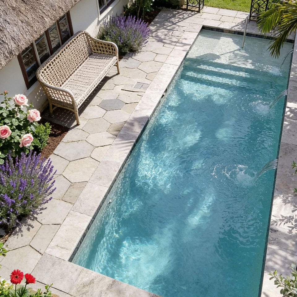 สระว่ายน้ำไฟเบอร์กลาสสุดหรูในสวนหลังโรงแรม พร้อมสปาในตัวและอุปกรณ์สระว่ายน้ำครบครันเพื่อการพักผ่อนสำหรับครอบครัว