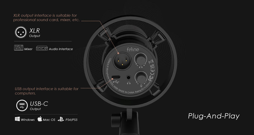 ไมโครโฟน Fifine K688 Studio XLR ไดนามิก ไมโครโฟน USB สำหรับพีซี ไมโครโฟนพอดแคสต์ สำหรับการบันทึกเสียงและสตรีมสดระดับมืออาชีพ