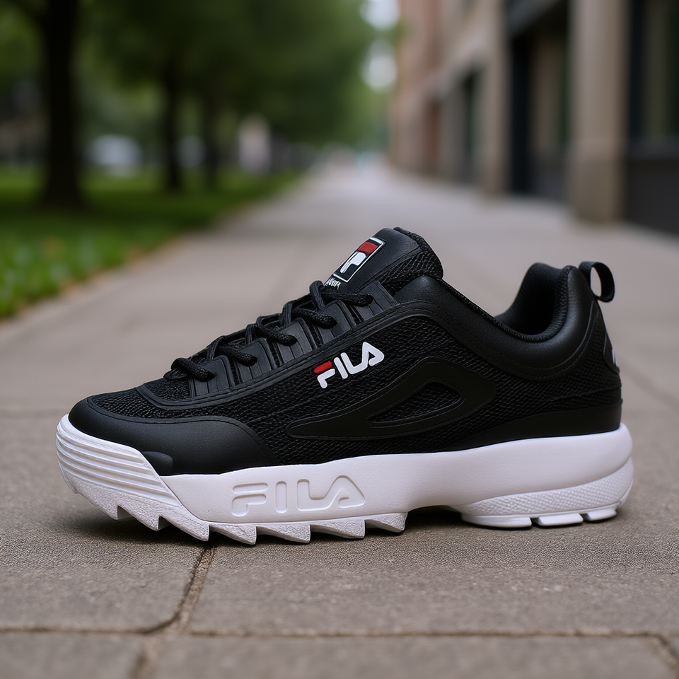 รองเท้าลำลองหุ้มข้อสูง Fila Disruptor II สำหรับผู้ชาย สีดำ หน้าผ้าตาข่าย ปิดเชือก ยางพื้นรองเท้าด้านนอก พื้นรองเท้าชั้นกลาง EVA เหมาะกับทุกฤดู สไตล์เดินเล่น