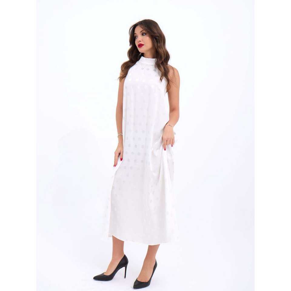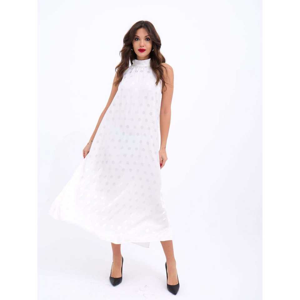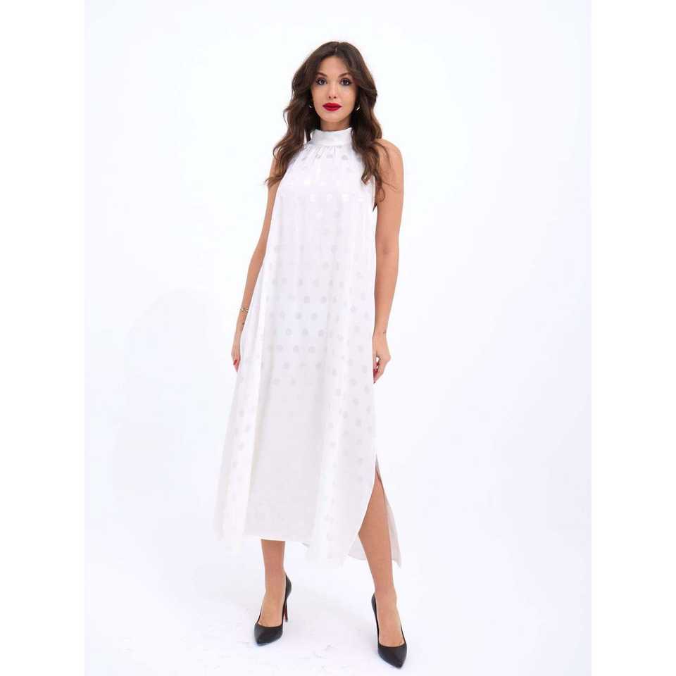 เดรสทรงเอไลน์สีขาวลายจุด คอสูง แบรนด์ Filedeliya ผ้าทอระบายอากาศได้ดี เหมาะสำหรับใส่ลำลองหรือไปงานปาร์ตี้