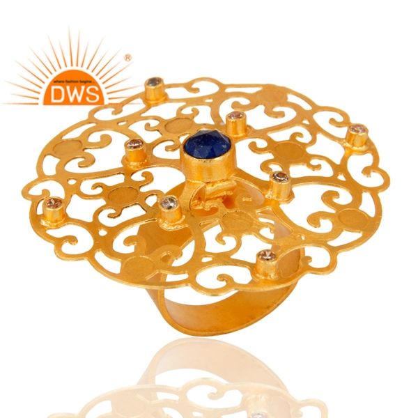 Filigree Flower Design 18k Gold Plated Brass Fashion Cocktail Ring Blue Aventurine Zircon Gemstone Ring Jewelry Supplier