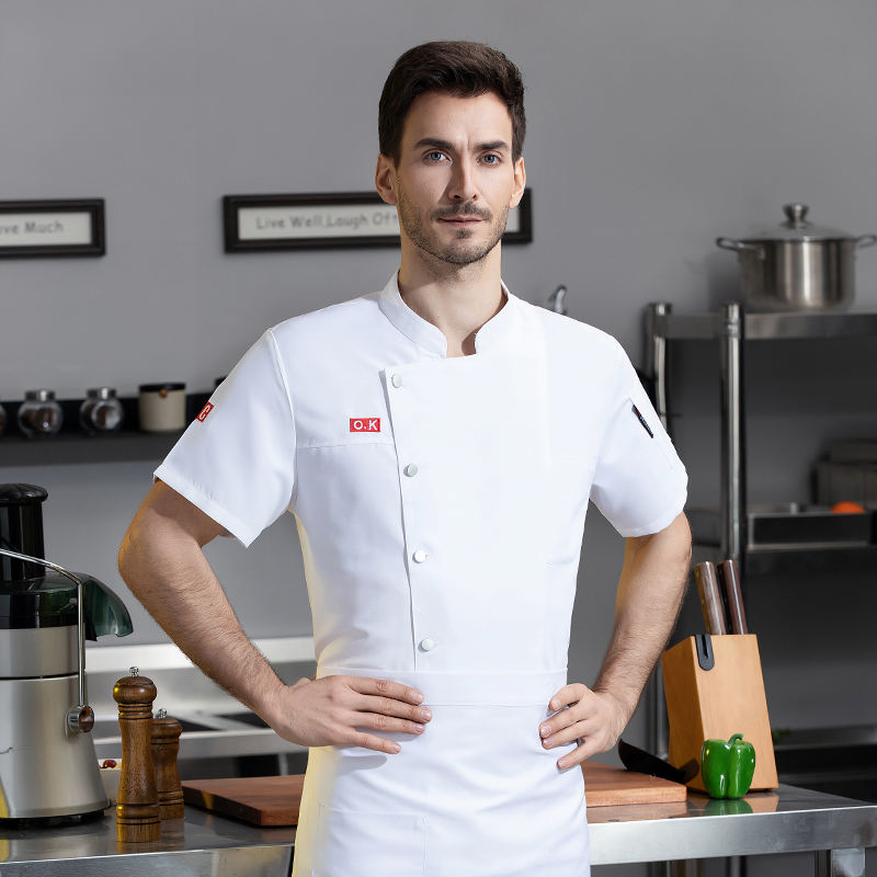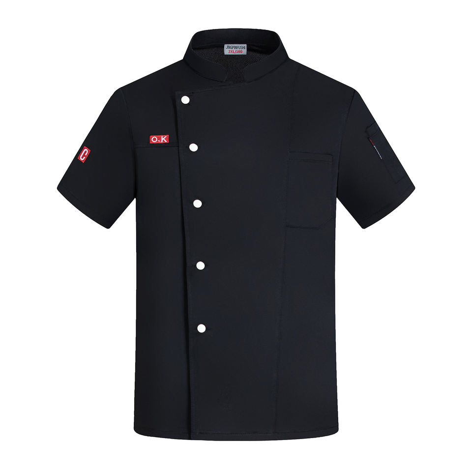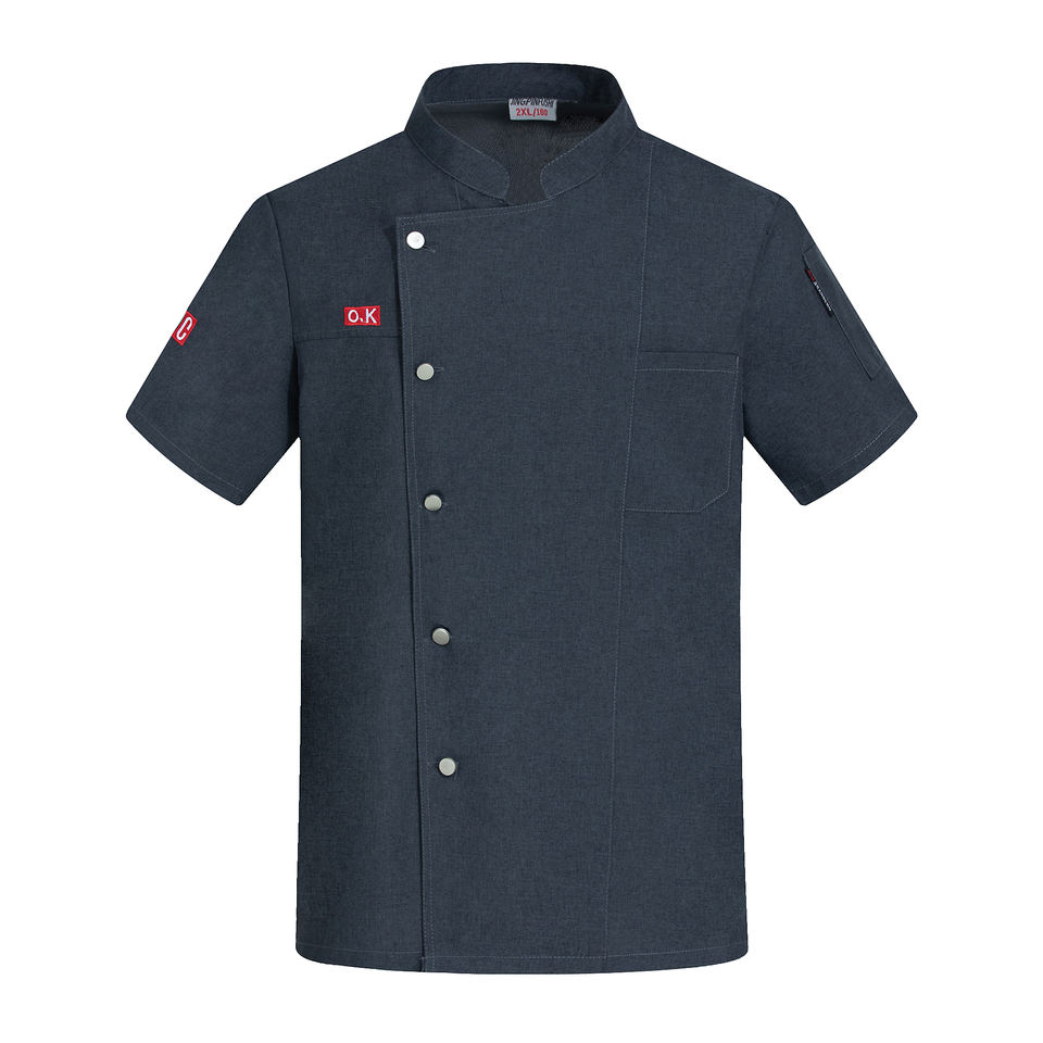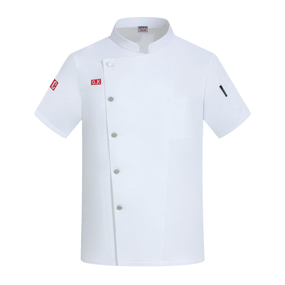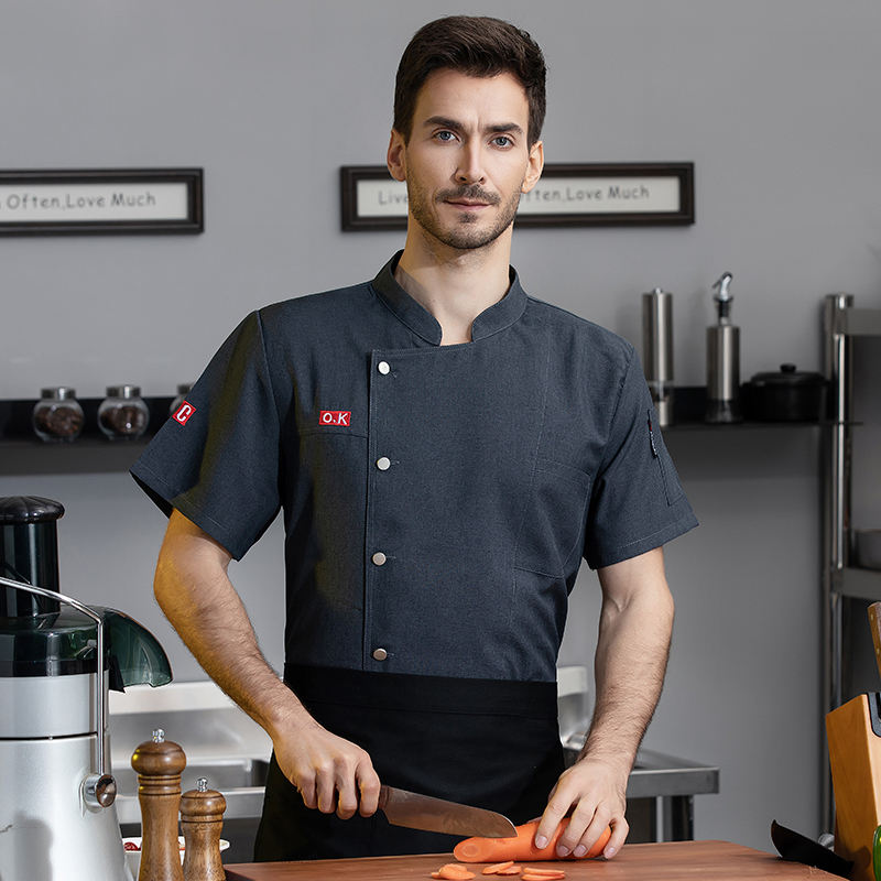 เสื้อเชฟแขนสั้นผ้าแคนวาสเนื้อดี ผ้าฝ้ายผสมโพลีเอสเตอร์ ติดกระดุม ปักลายได้ 男女兼用