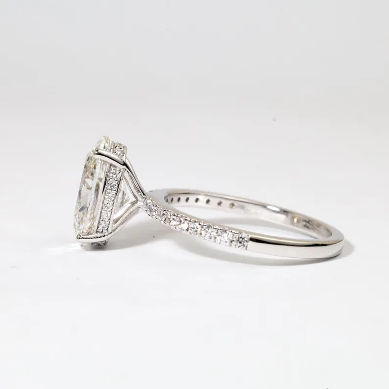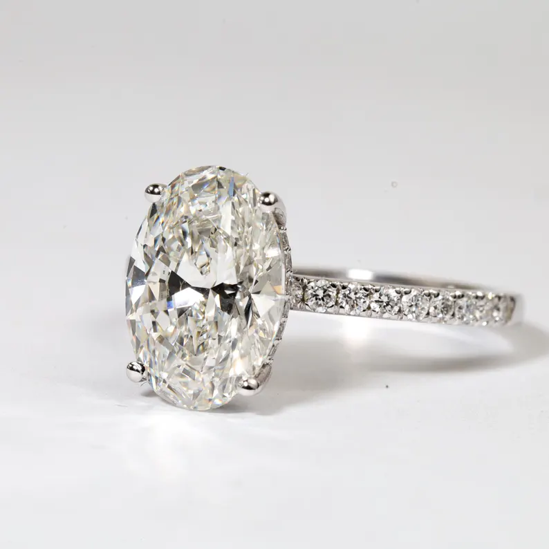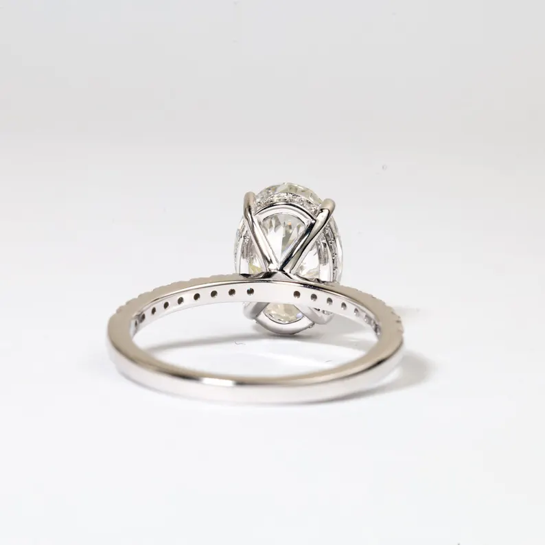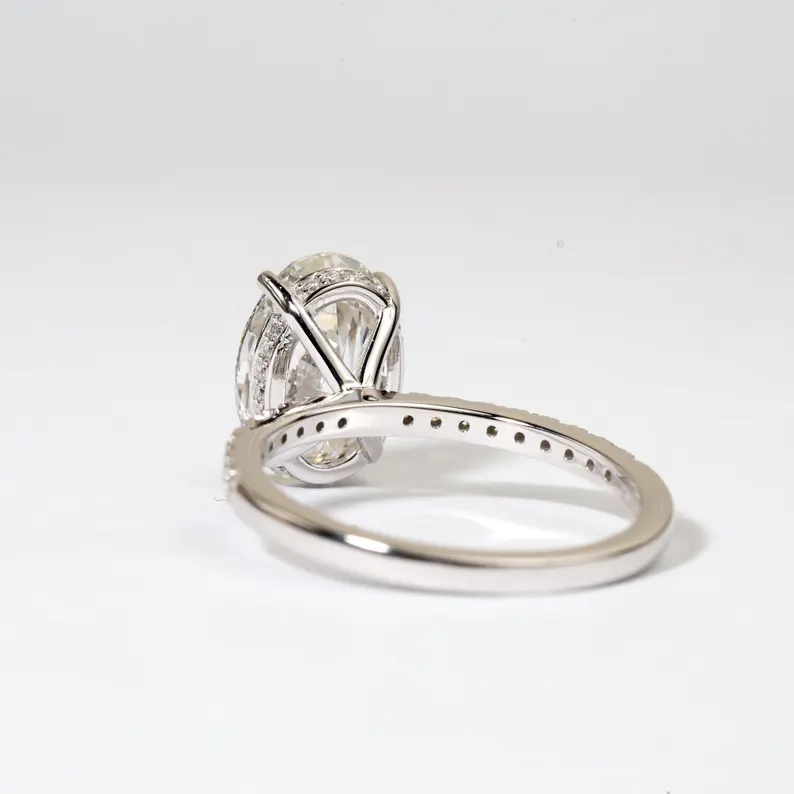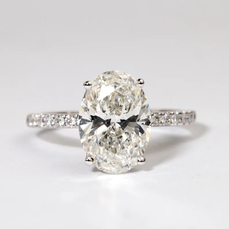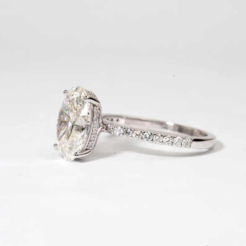 แหวนเพชรทรงรีเพาะเลี้ยงในห้องปฏิบัติการ งานฝีมือประณีตจากทองคำขาว ประดับเพชรเม็ดเดี่ยว พร้อมเพชรประดับเล็กๆ สำหรับเป็นของขวัญเจ้าสาว