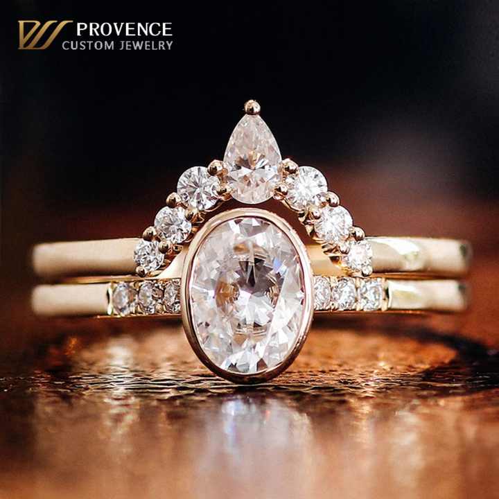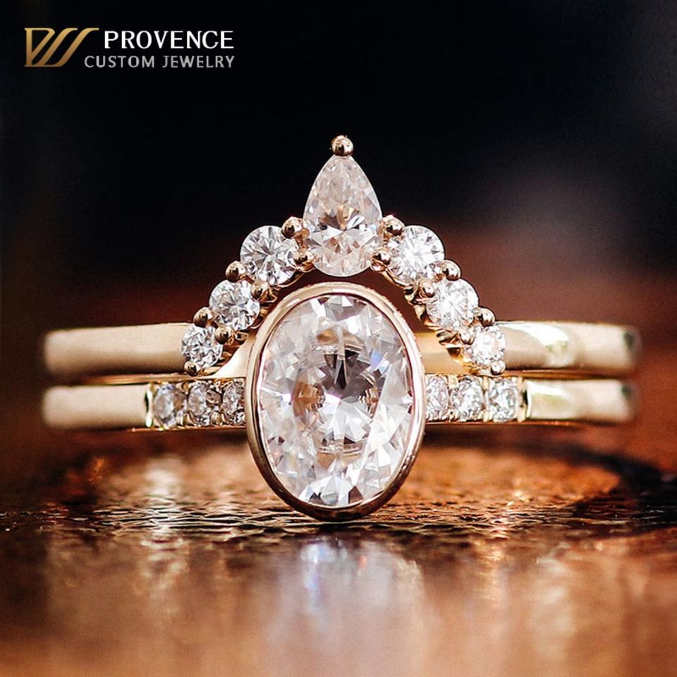แหวนเพชรแท้ ทองคำแท้ 10k 14k 18k แหวนหมั้นเพชรทรงรี ตัวเรือนแบบ Bezel Setting เพชรทรงรี D VVS มอยส์ซาไนต์ ชุดแหวนแต่งงาน