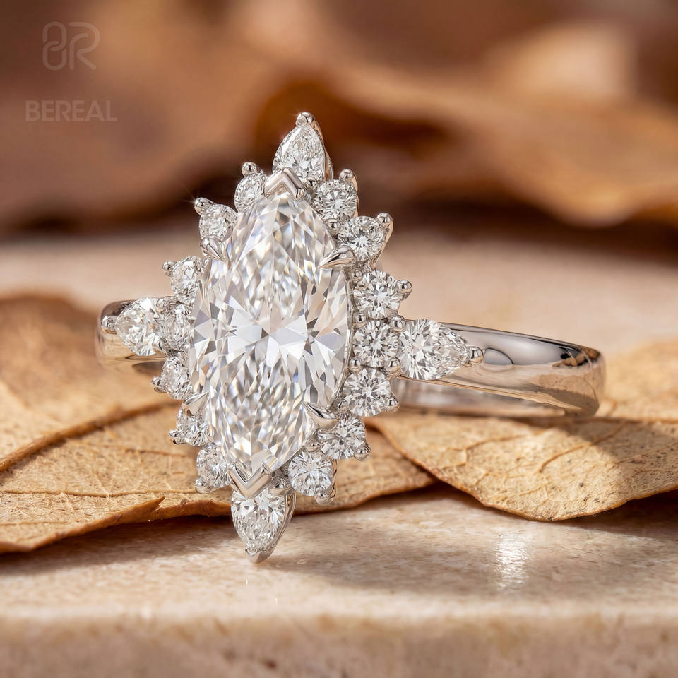 แหวนเพชรแต่งงานเพชรเลี้ยงในห้องปฏิบัติการคุณภาพสูง VVS รับรองโดย IGI ทรงมาร์คีส์ แหวนเพชรเลี้ยงในห้องปฏิบัติการแบบวงแหวนล้อมเพชร แหวนเพชรแบบสั่งทำพิเศษสำหรับผู้หญิง