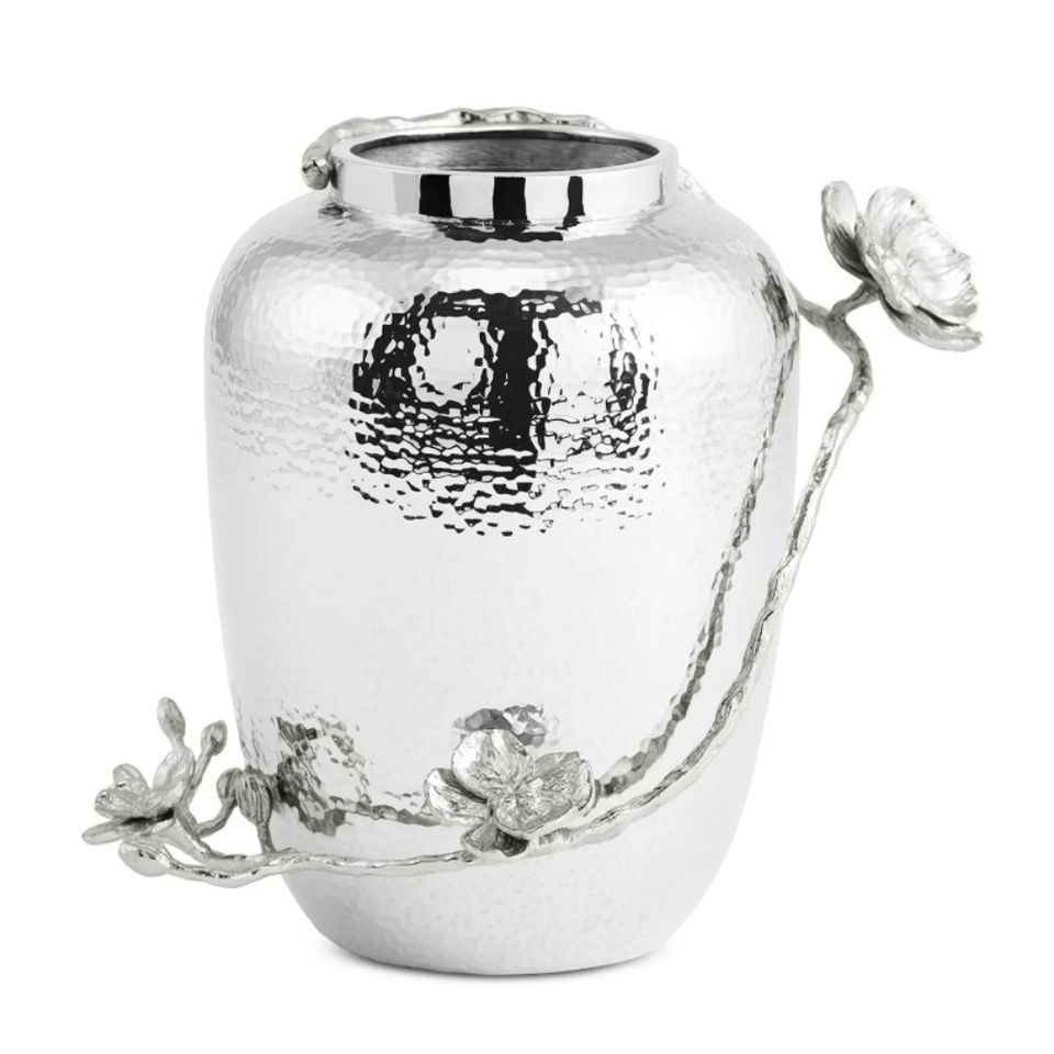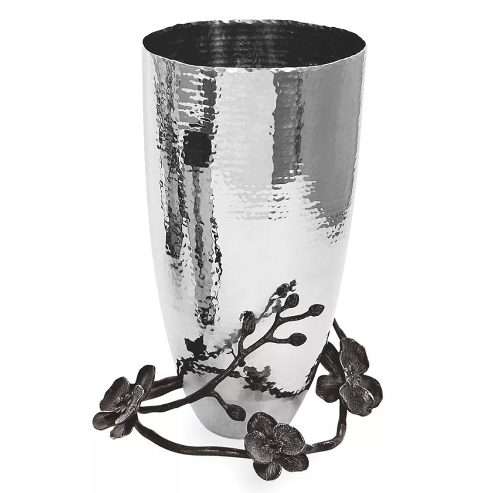 แจกันทรงสี่เหลี่ยมทำจากสแตนเลสขัดเงาพร้อมก้านดอกทองเหลืองและดอกซากุระเคลือบเงาสำหรับบ้านสุดหรู
