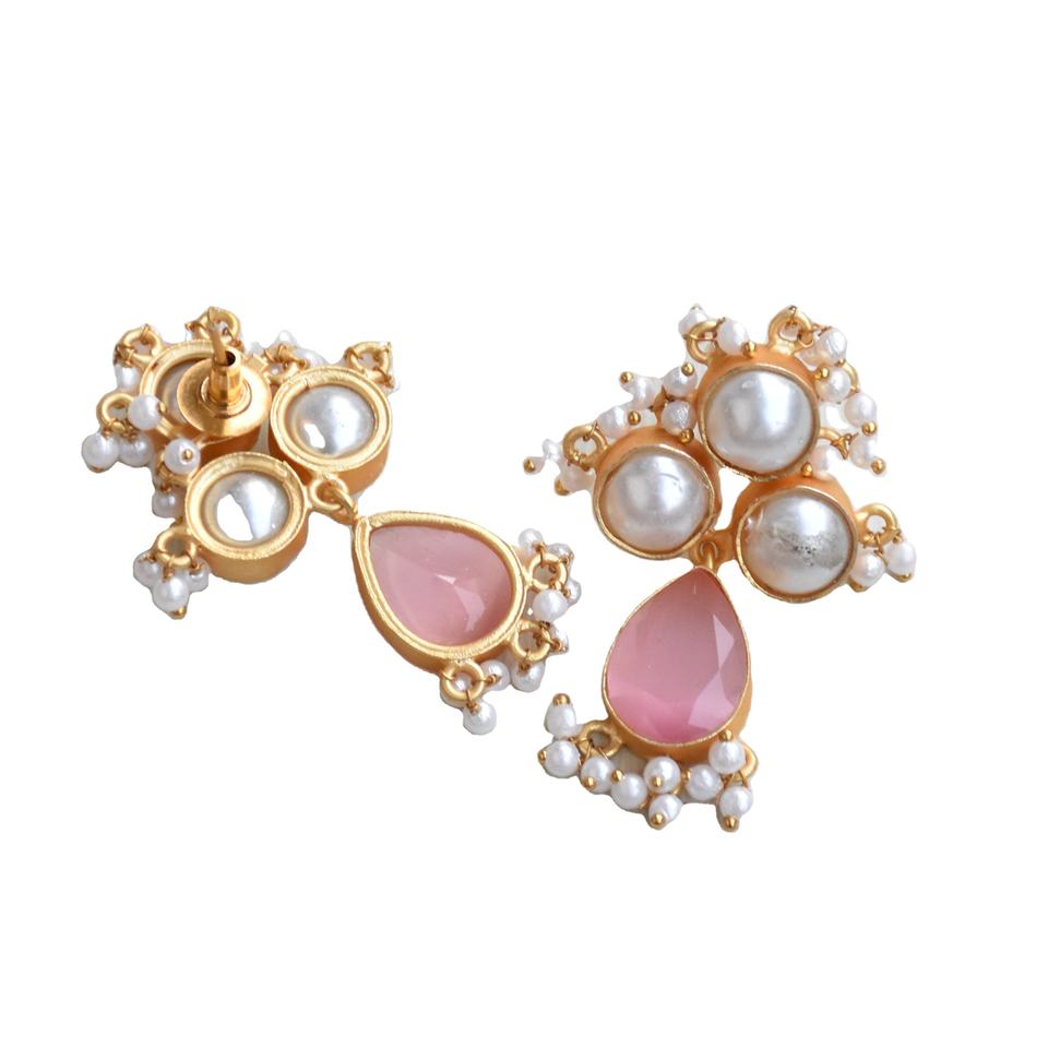 ต่างหูทองเหลืองขายส่ง ต่างหูมุกและหินธรรมชาติ ต่างหูทองเหลืองผิวซาติน ดีไซน์ลายเฉพาะตัว คุณภาพสูง