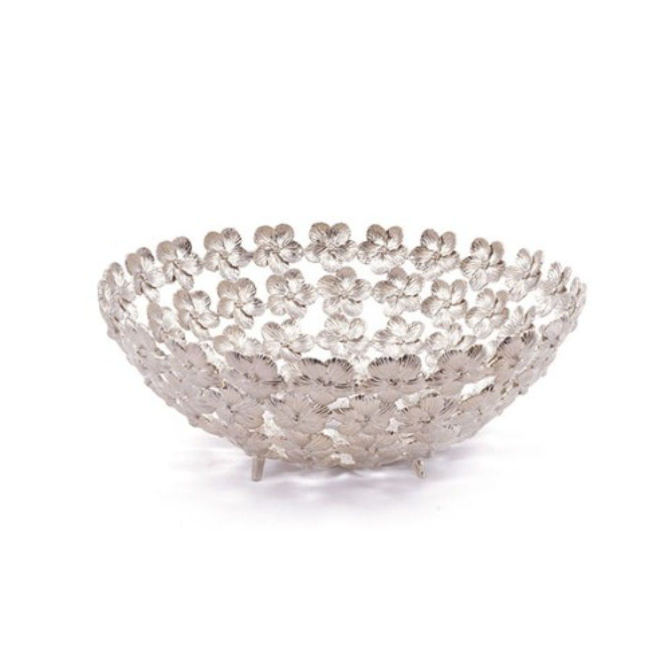 ชามเสิร์ฟผลไม้ตกแต่งอย่างมีสไตล์ทำจากโลหะเงินพร้อมชามสลัดที่เน้นดอกไม้