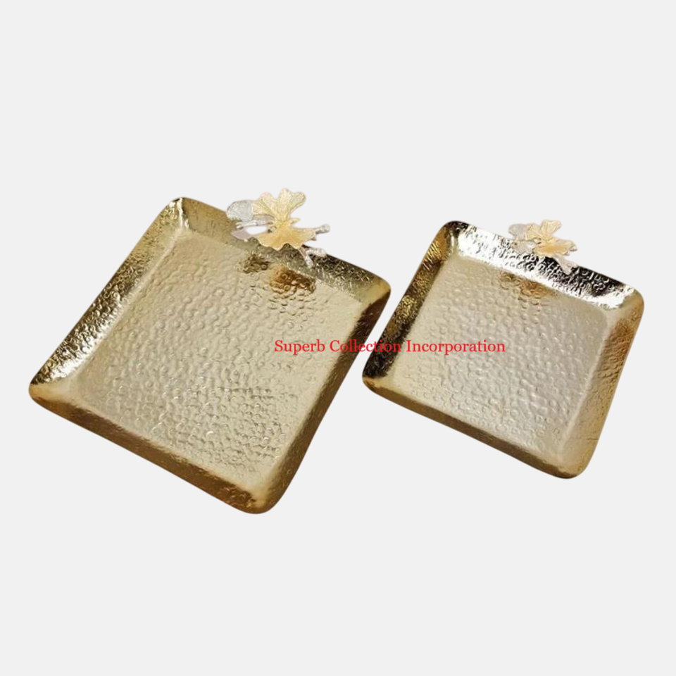 ถาดเสิร์ฟอาหารทรงสี่เหลี่ยมสีทองพร้อมที่จับมุกดีไซน์แฟนซีถาดสแตนเลสคุณภาพดีที่สุด
