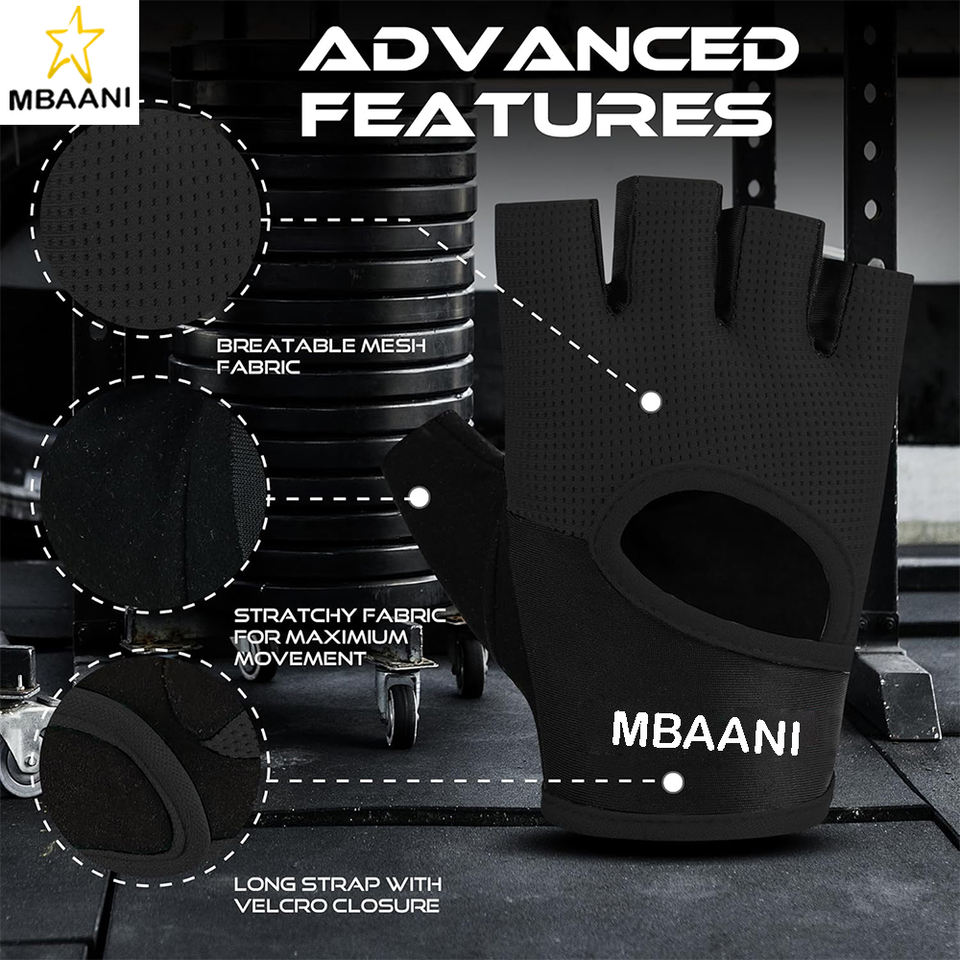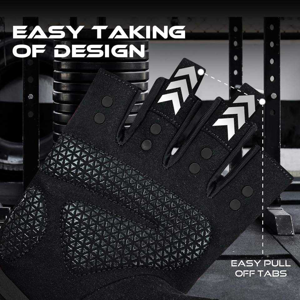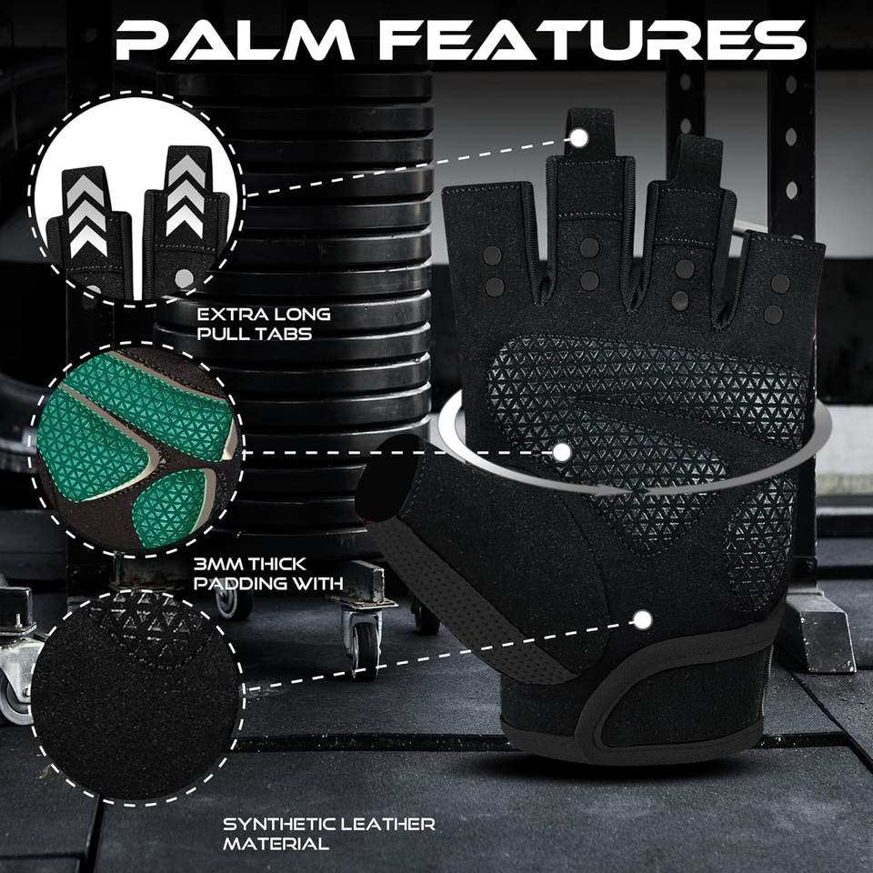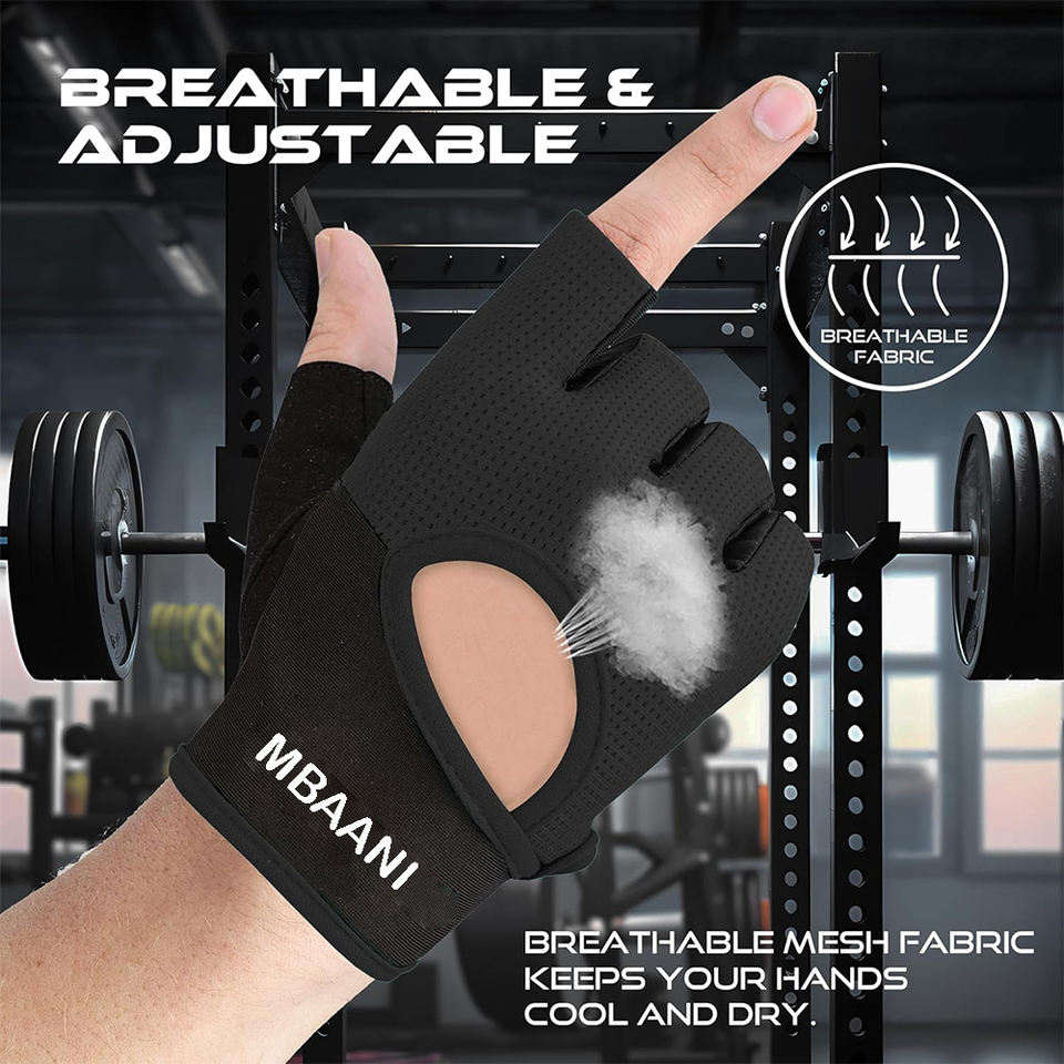 ถุงมือออกกำลังกายแบบไร้นิ้วพร้อมแผ่นป้องกันฝ่ามือ ระบายอากาศได้ดีและน้ำหนักเบา เหมาะสำหรับยกน้ำหนัก ปั่นจักรยาน และดึงข้อ