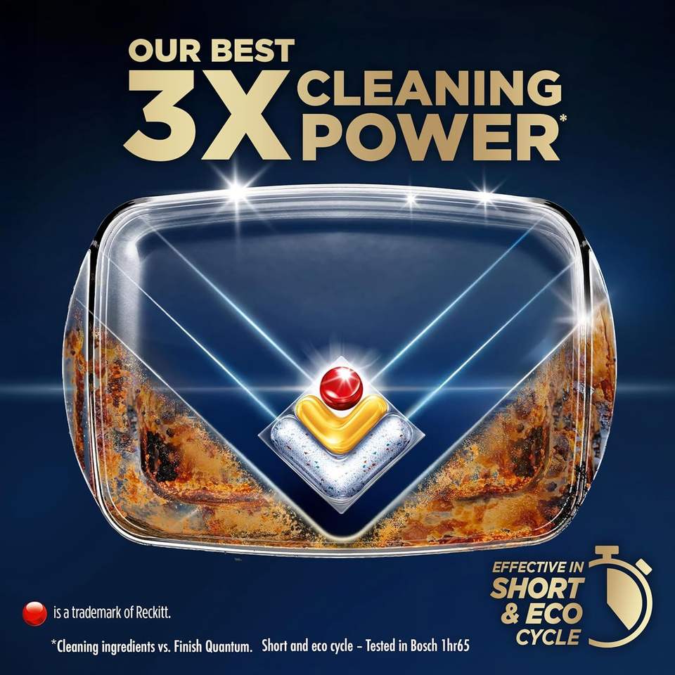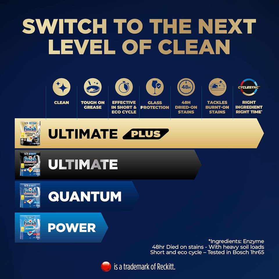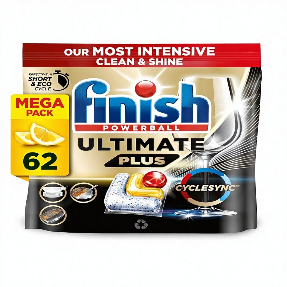 แท็บเล็ตสำหรับเครื่องล้างจาน Finish Ultimate Plus 62 เม็ด กลิ่นเลมอน สูตรขจัดคราบมันฝังแน่น สำหรับการล้างที่เข้มข้นที่สุดของเรา